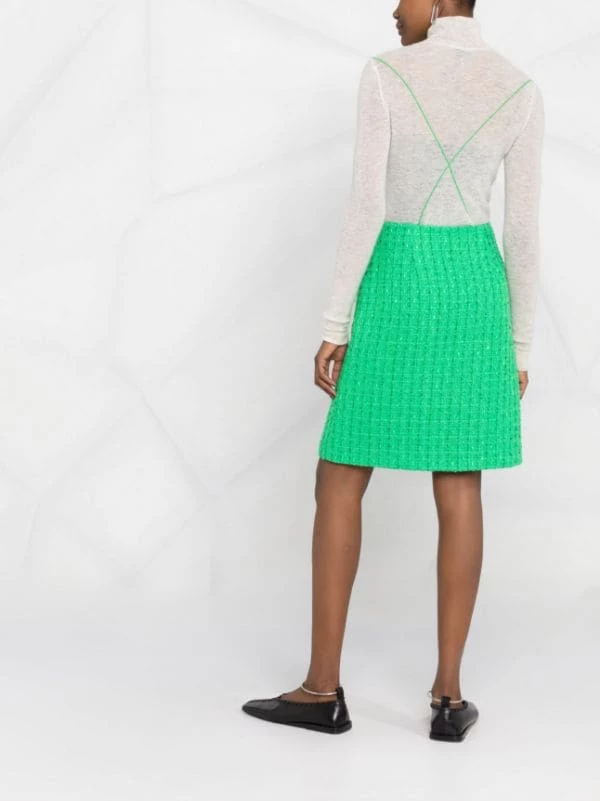 Tweed, tissage métallisé, taille haute, boutonnière dissimulée sur le devant, deux poches à rabat sur le devant, fente sur le devant, hauteur genou.