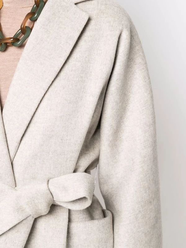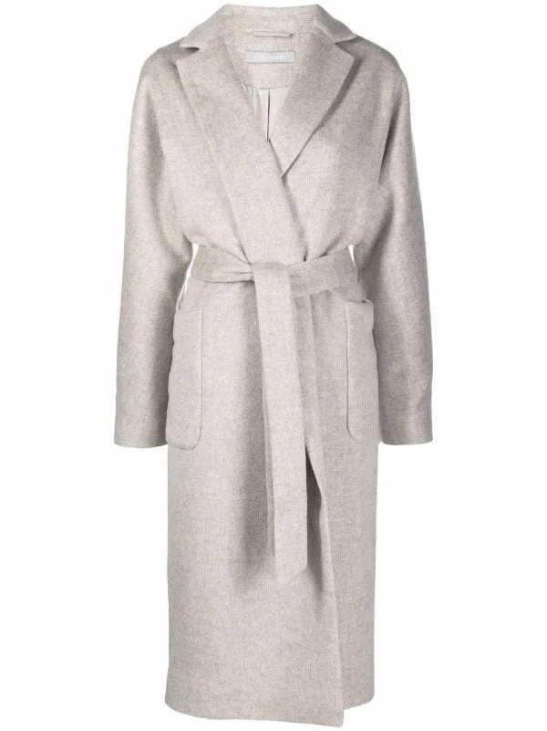 Revers classiques, taille ceinturée, deux poches plaquées, manches longues.