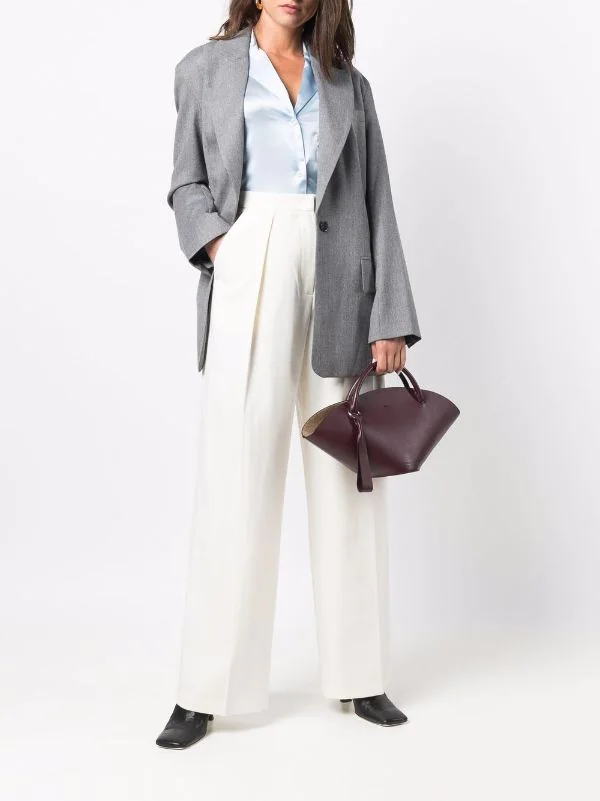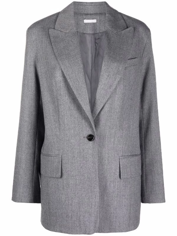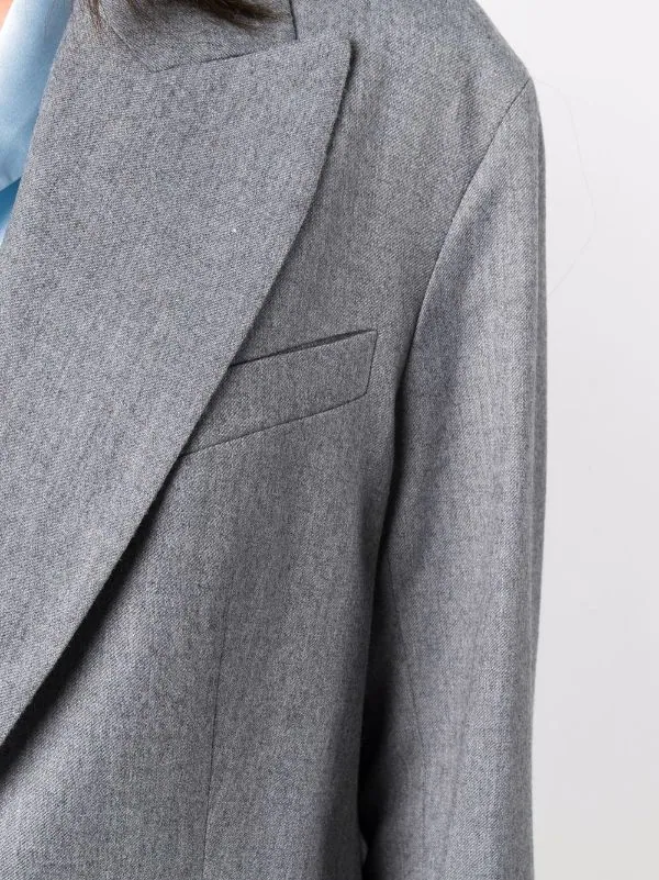 Revers pointus, boutonnière sur le devant, poche passepoilée sur la poitrine, poches devant à rabat, manches longues, fente à l’arrière, ourlet droit. Couleur : gris. Matière : laine.