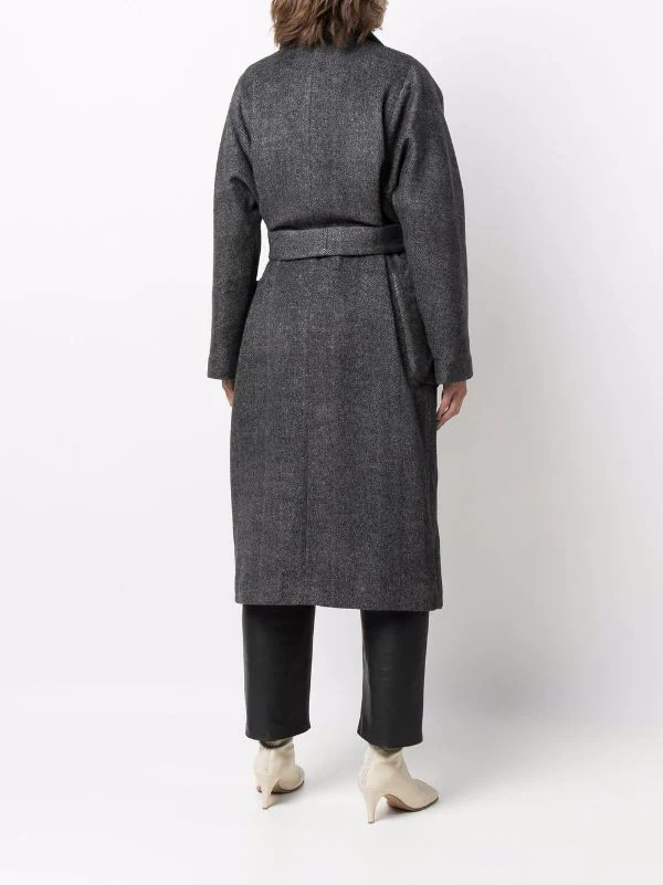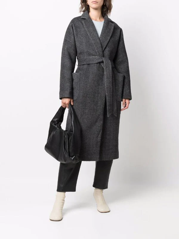 Gris foncé, revers classiques, taille ceinturée, coupe mi-longue, deux poches plaquées avant.