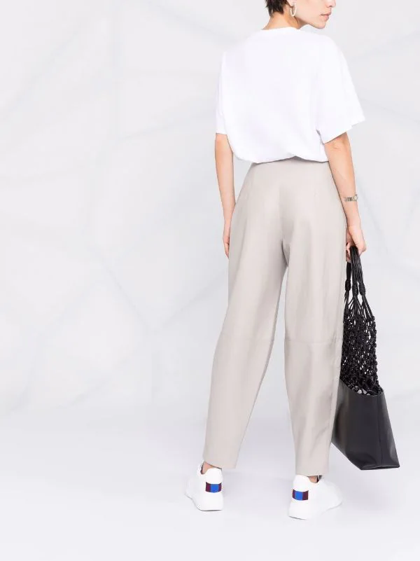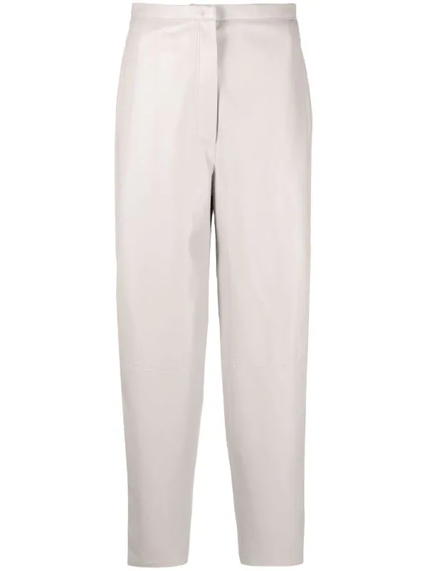 Coupe fuselée, taille haute, fermeture dissimulée sur le devant, poches plaquées latérales. Couleur : gris.
