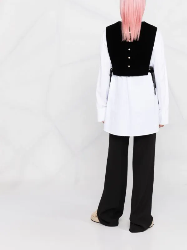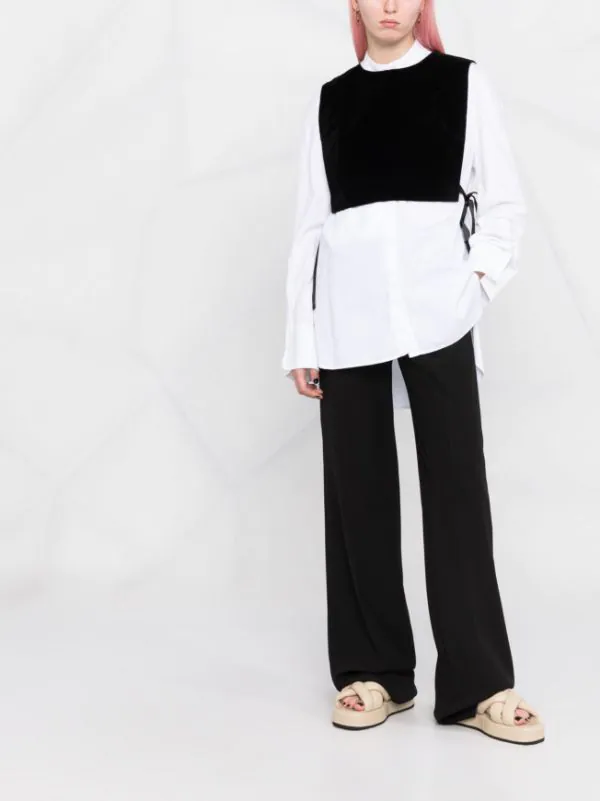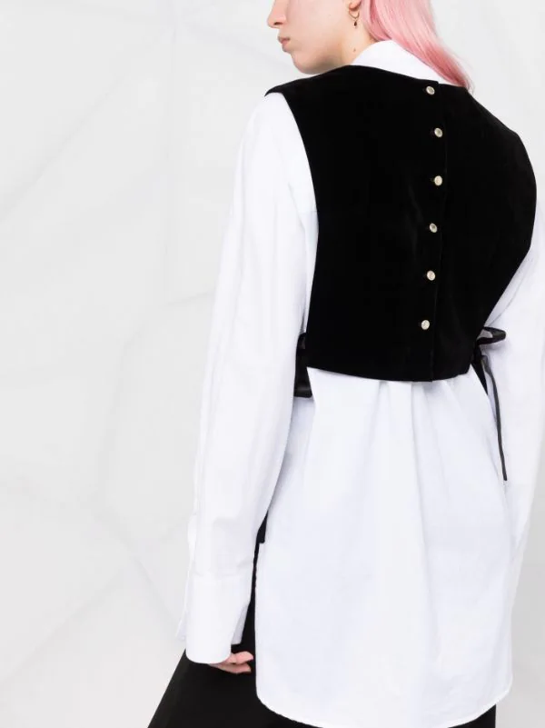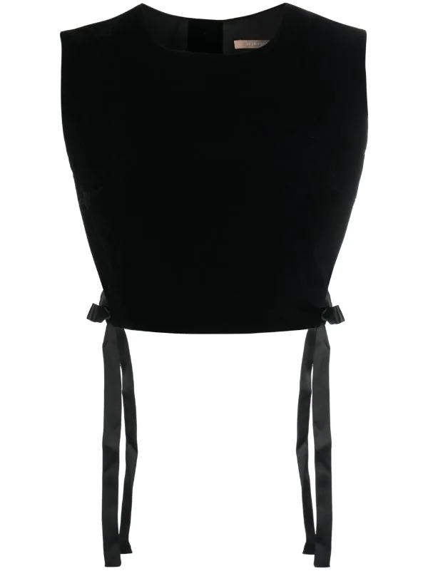 Effet velours, encolure ronde, boutonnière à l’arrière, fermeture à nouer sur les côtés, design sans manches, coupe courte. Couleur : noir.