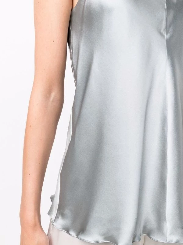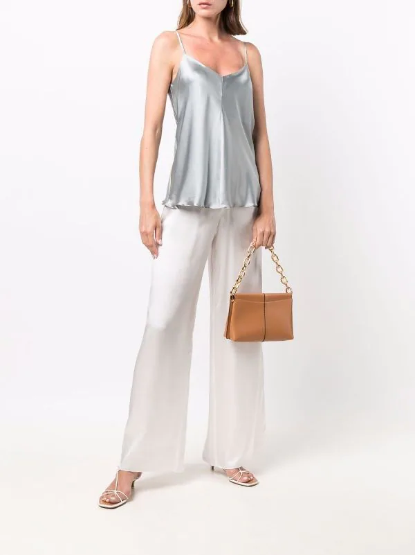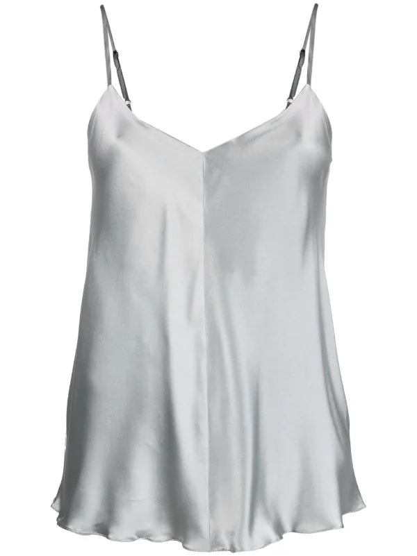 Fini satiné, fines bretelles, col v, ourlet droit. Matière : soie.