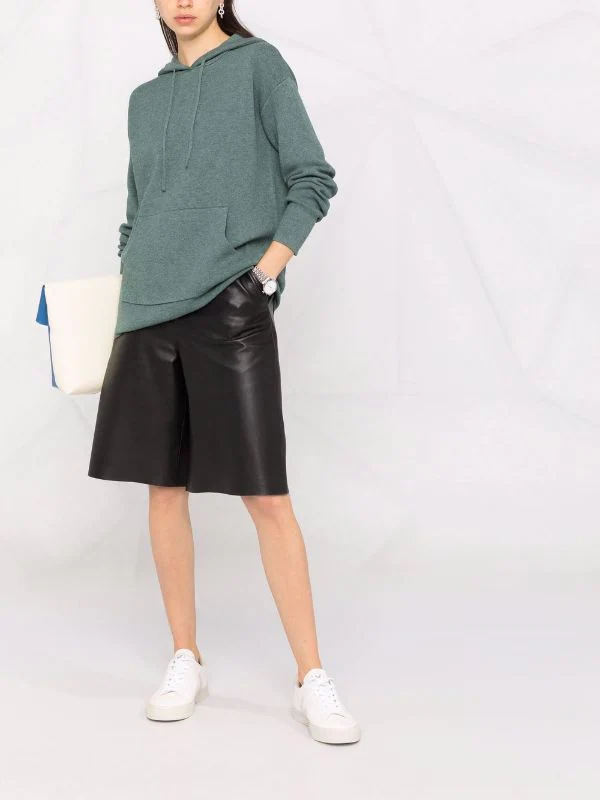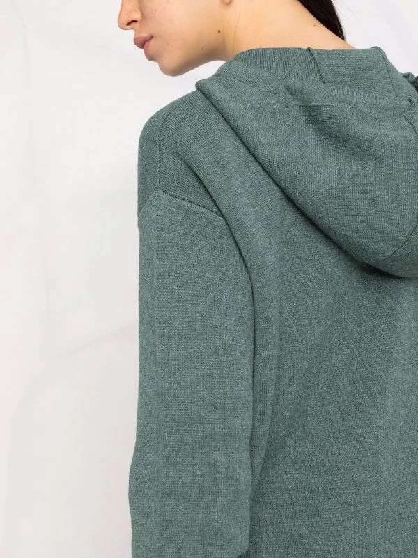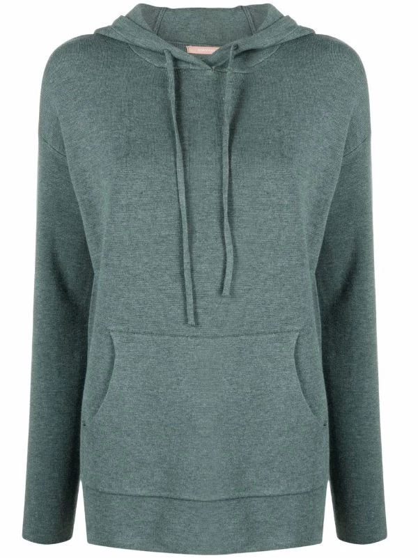 Effet chiné, maille fine, capuche à lien de resserrage, effet d’épaules descendues, manches longues, poche plaquée sur le devant.