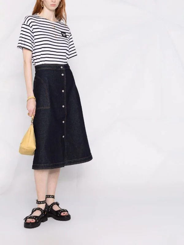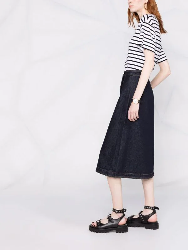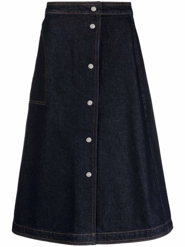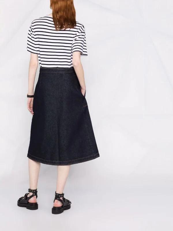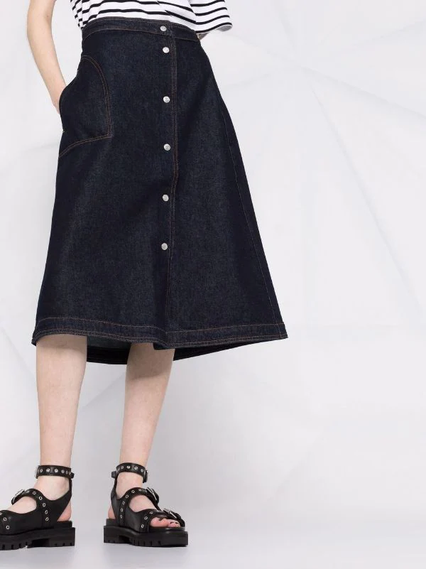 Coutures contrastantes, taille haute, coupe trapèze, boutonnière sur le devant, deux poches latérales fendues, coupe mi-longue.