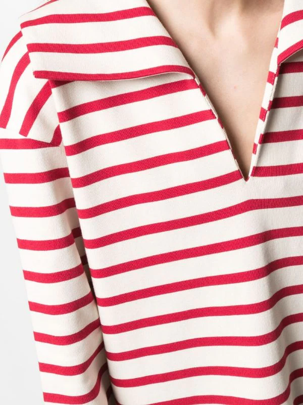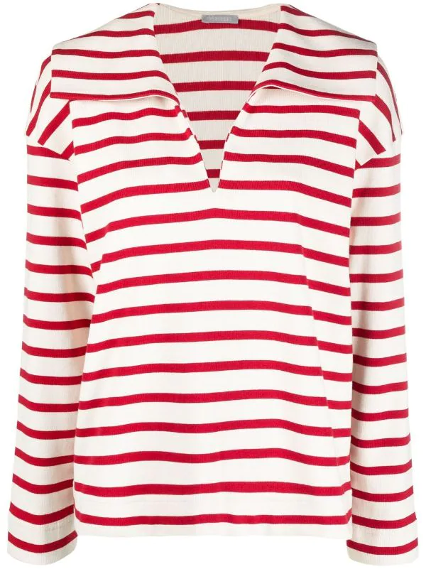 Rayures horizontales imprimées, col italien, col v, manches longues. Matière : coton.