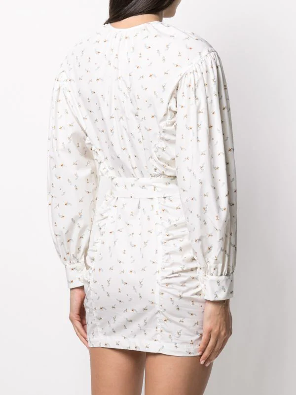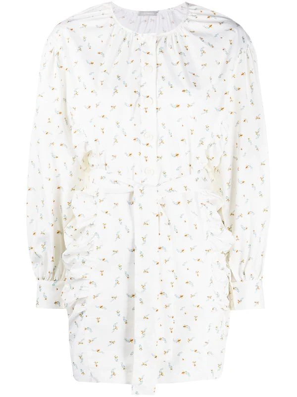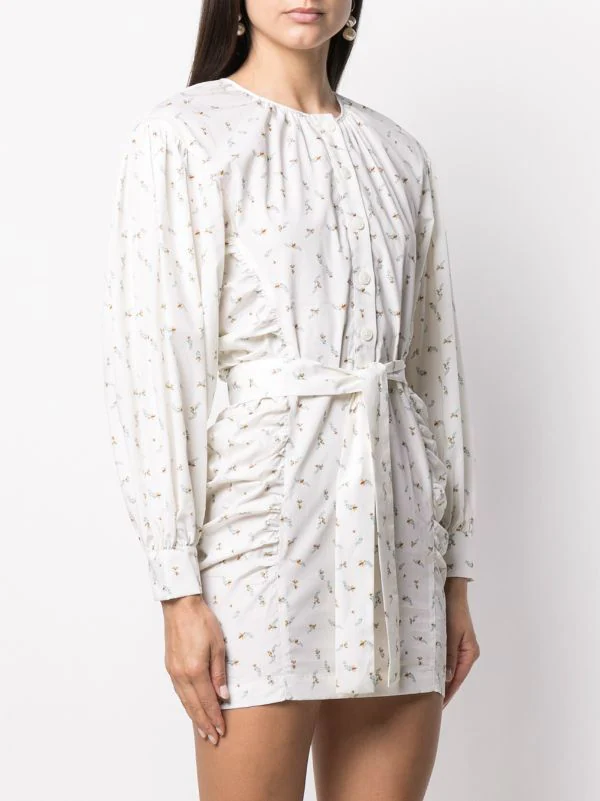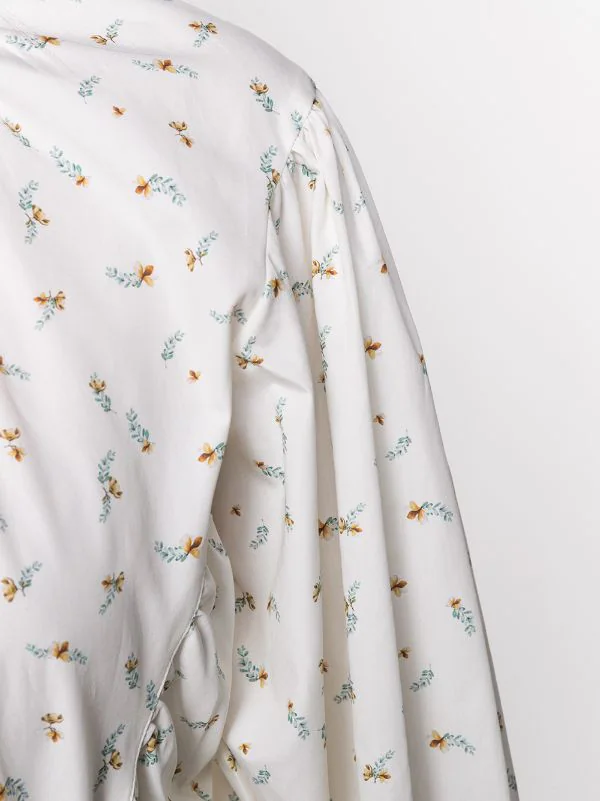 Encolure ronde, boutonnière sur le devant, manches bouffantes longues, taille nouée, imprimé à fleurs, détails de fronces. Couleur : blanc. Matière : coton.