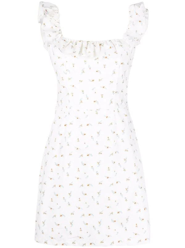 Motif de fleurs, détails de volants, encolure carrée, ourlet droit. Matière : coton.