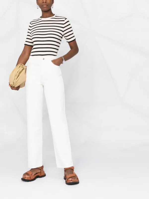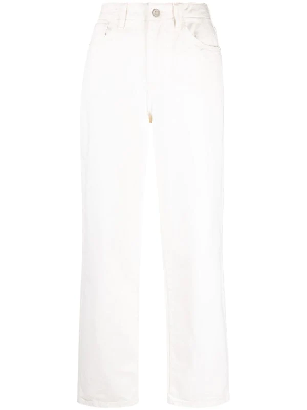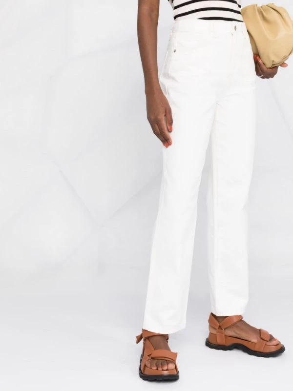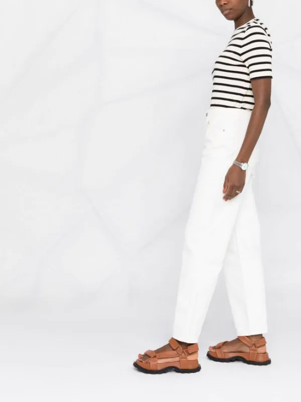 Taille haute, passants de ceinture, fermeture à braguette dissimulée et bouton, cinq poches classiques, coupe droite, hauteur cheville. Matière : coton.