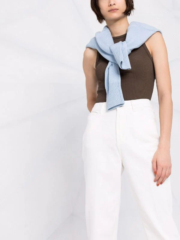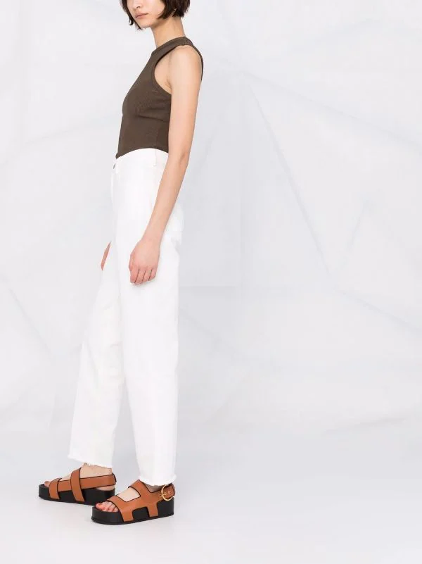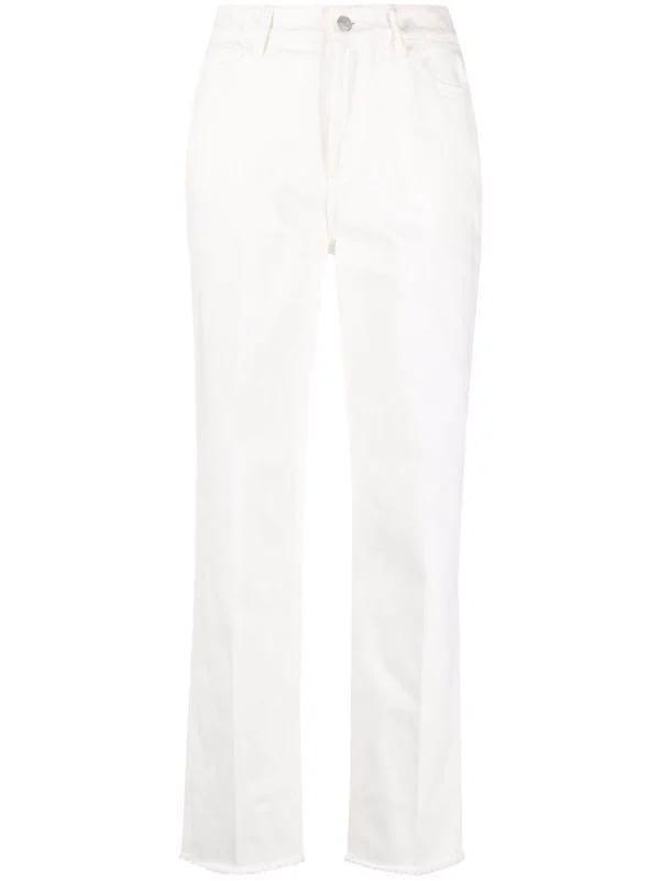 Design ton sur ton, taille haute, fermeture à zip et boutons sur le devant, passants de ceinture, poches latérales arrondies, coupe droite, poches arrière plaquées. Couleur : blanc. Matière : coton.