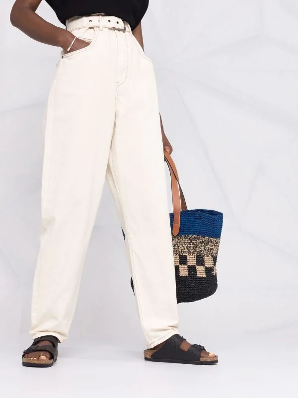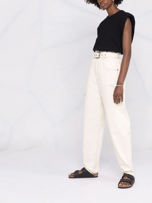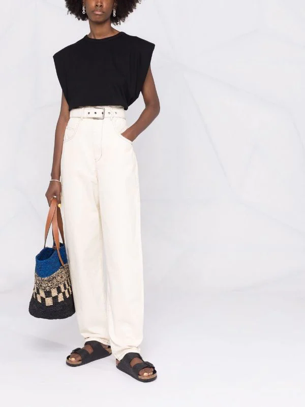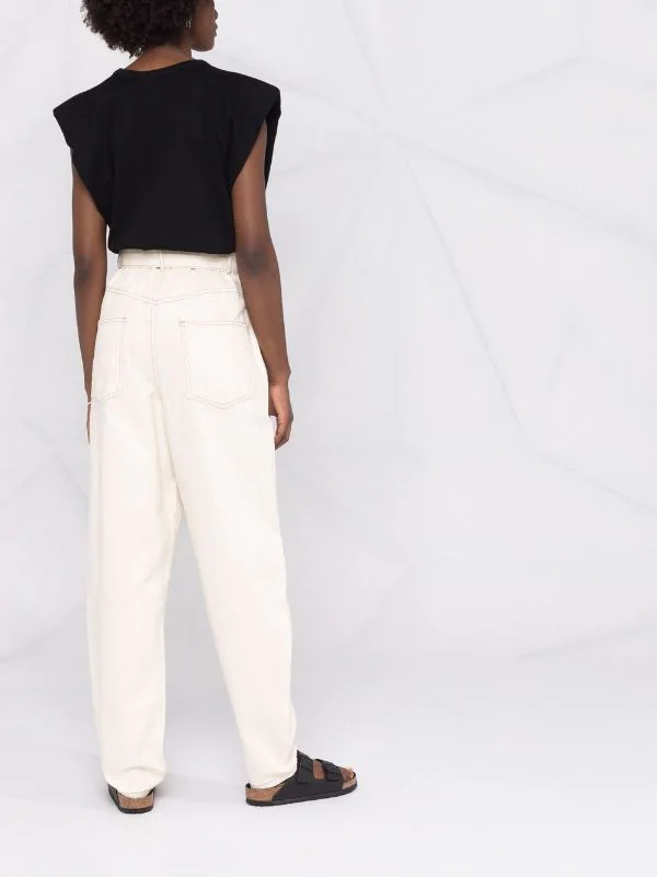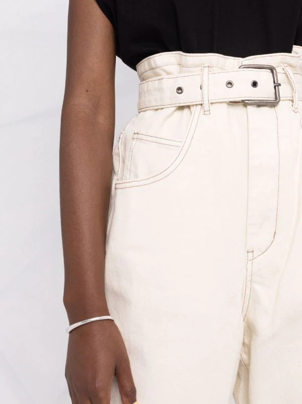 Coutures contrastantes, taille haute froncée, taille ceinturée, taille haute, cinq poches classiques, coupe ample. Matière : coton.