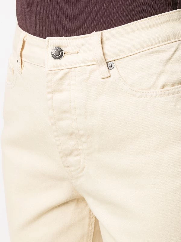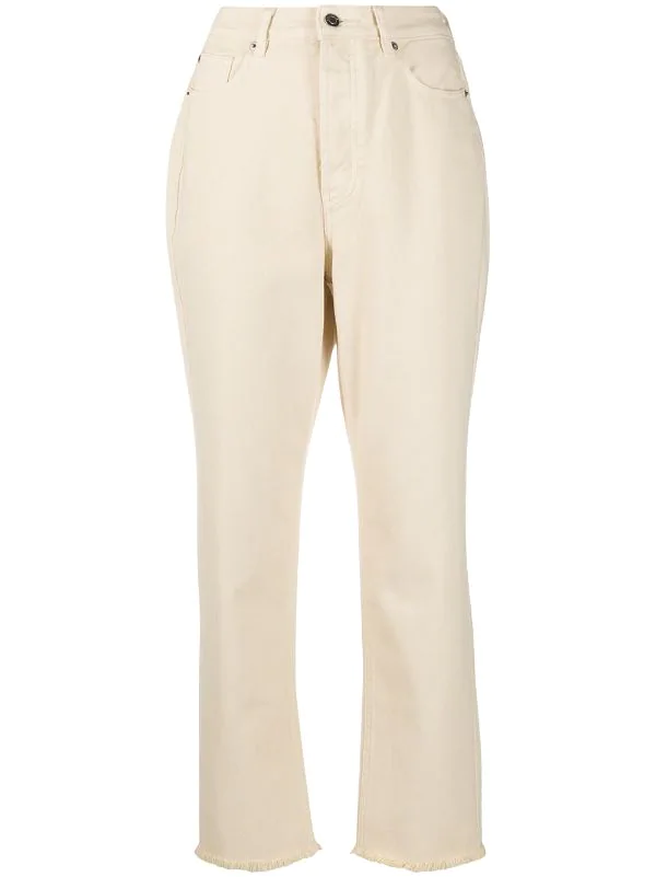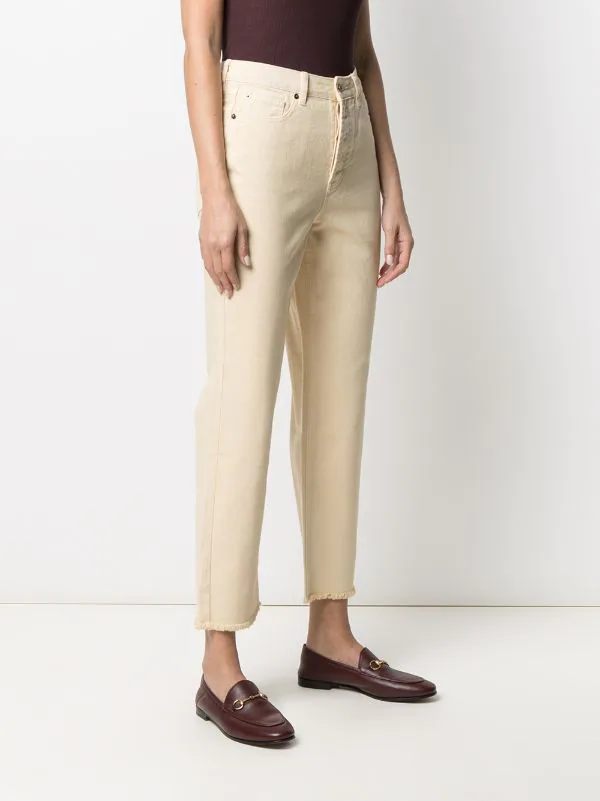 Passants de ceinture, taille haute, longueur crop, bords francs, fermeture zippée, 5 poches classiques, coupe droite. Matière : coton.
