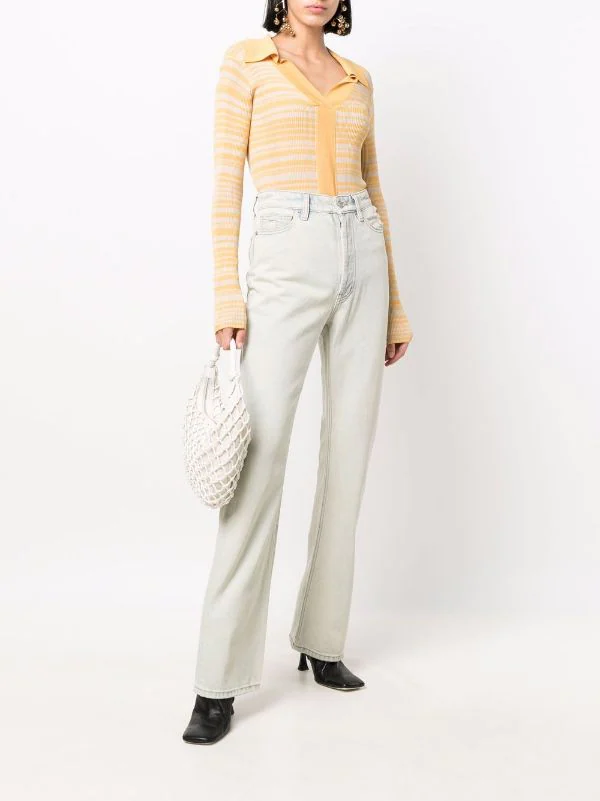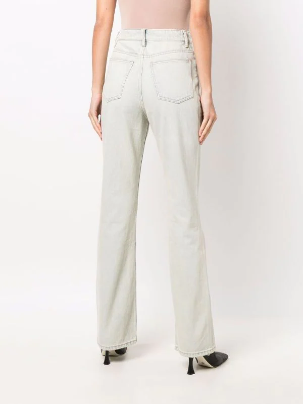 Coupe longue, taille haute, fermeture à zip et boutons sur le devant, cinq poches classiques. Matière : coton.