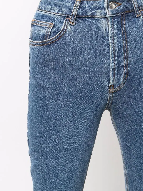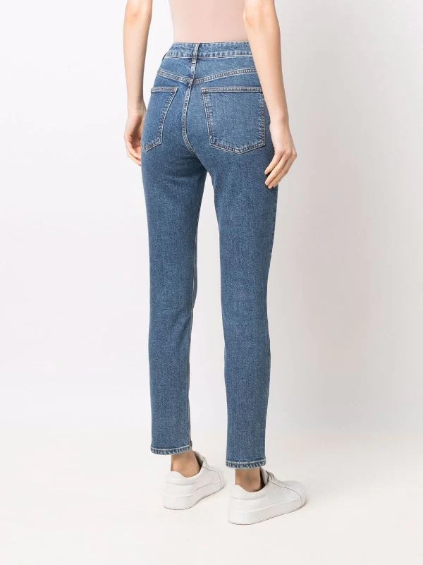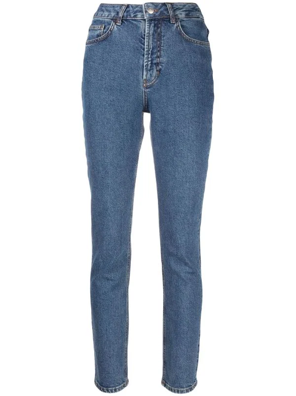 Bleu, effet semi-délavé, taille mi-haute, coupe slim, fermeture à zip et boutons sur le devant, cinq poches classiques.