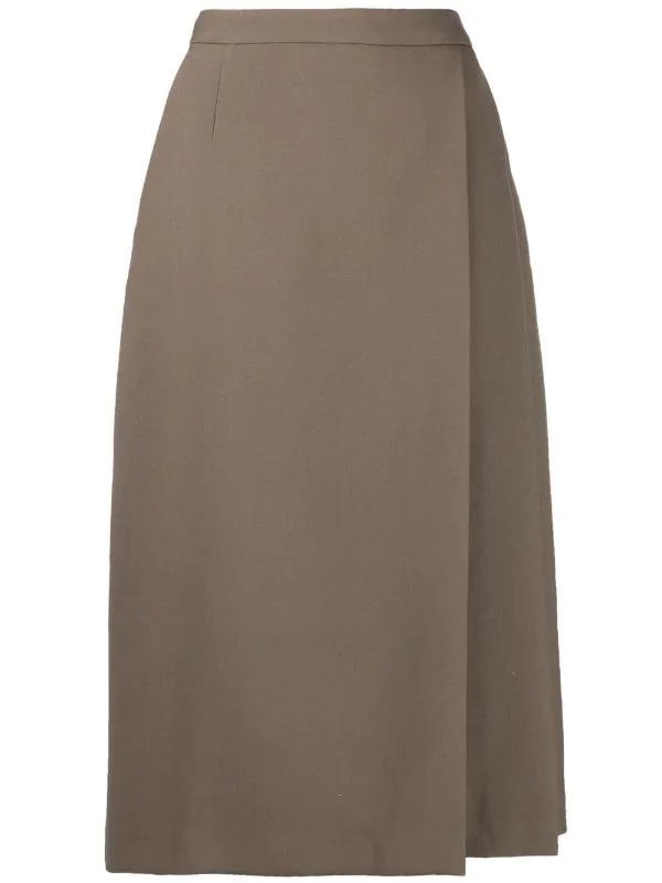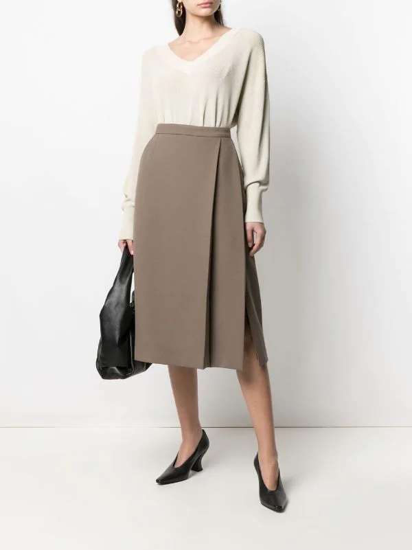 Design plissé, détails drapés, fentes latérales, taille haute, poches latérales fendues, fermeture zippée à l’arrière, doublure intégrale. Couleur : marron.