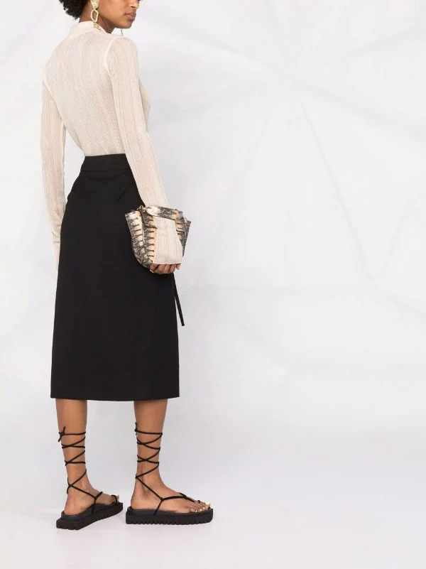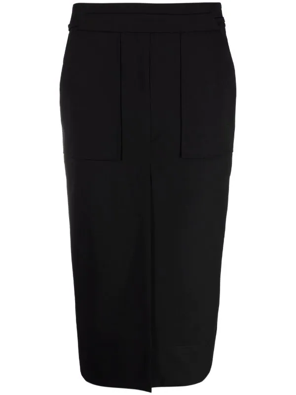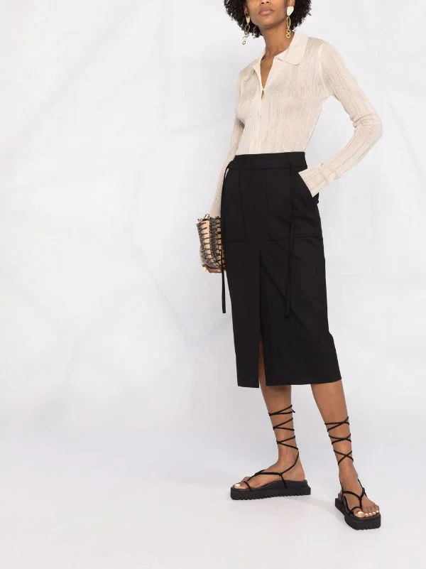 Taille mi-haute, fente sur le devant, deux poches latérales plaquées, coupe mi-longue. Couleur : noir.