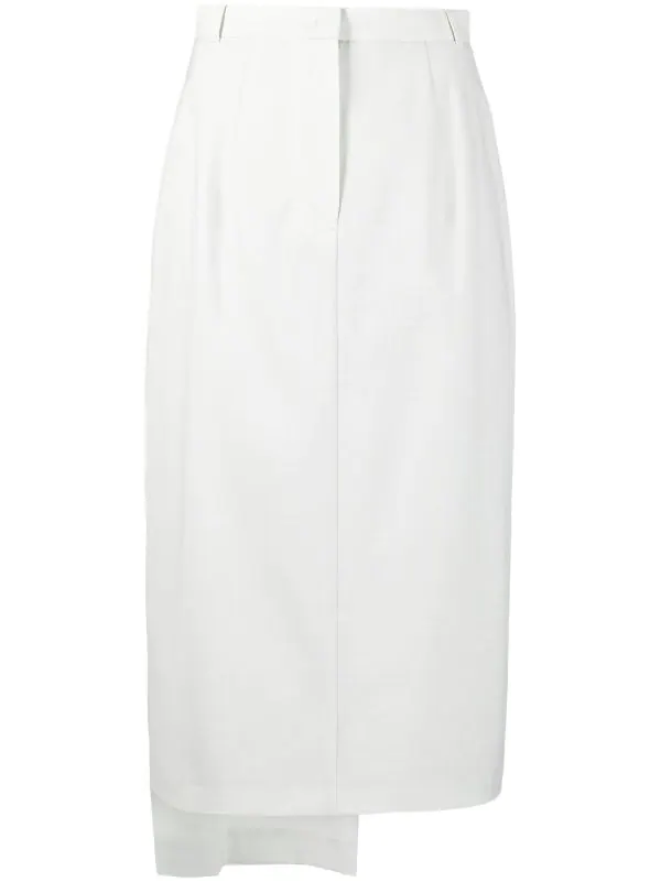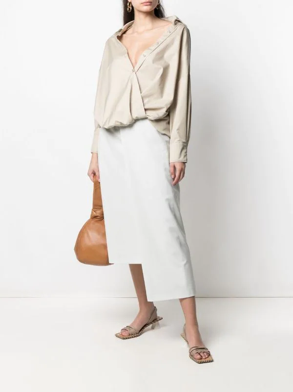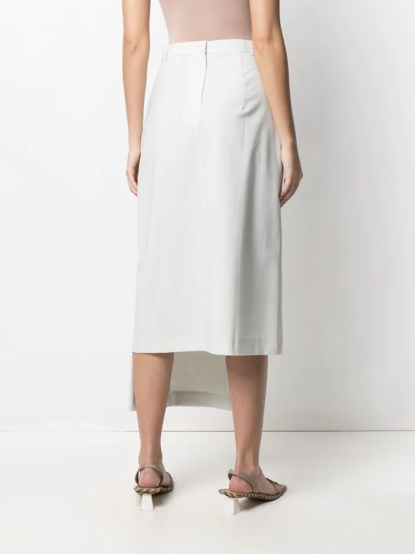 Design asymétrique, ourlet plus long au dos, détails drapés, passants de ceinture, deux poches boutonnées, fermeture zippée à l’arrière.