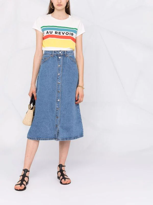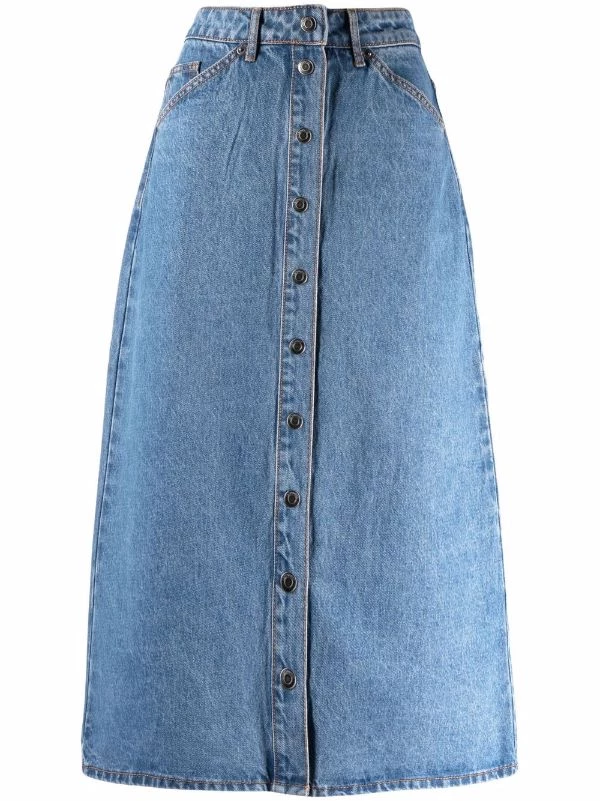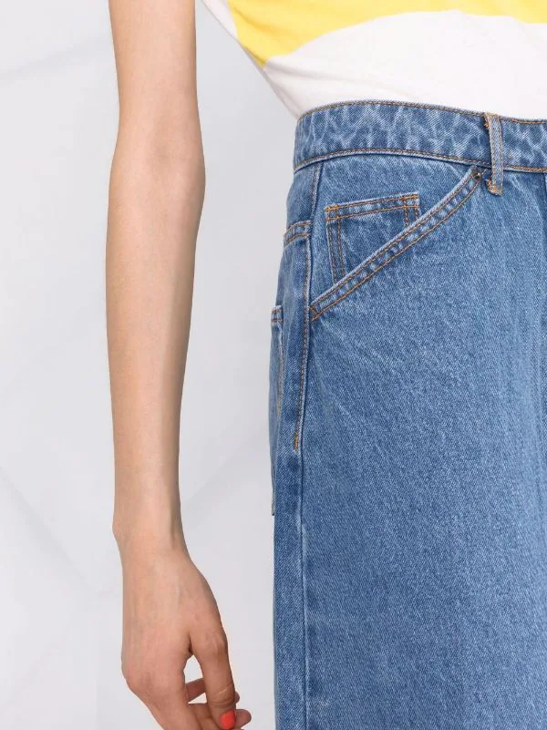 Taille haute, passants de ceinture, boutonnière sur le devant, cinq poches classiques. Couleur : bleu. Matière : coton.