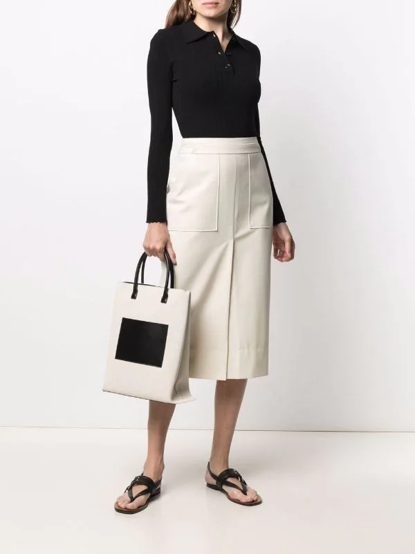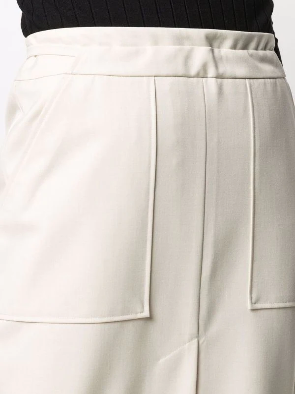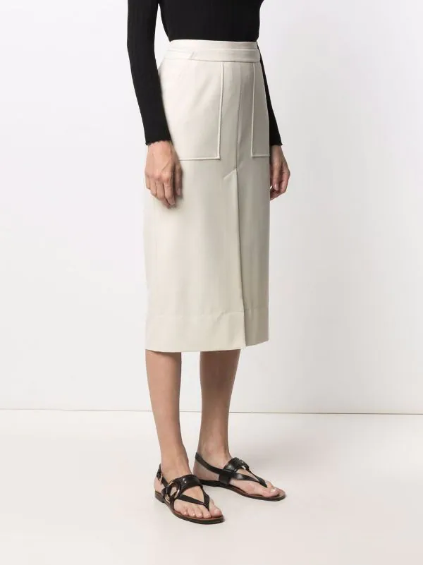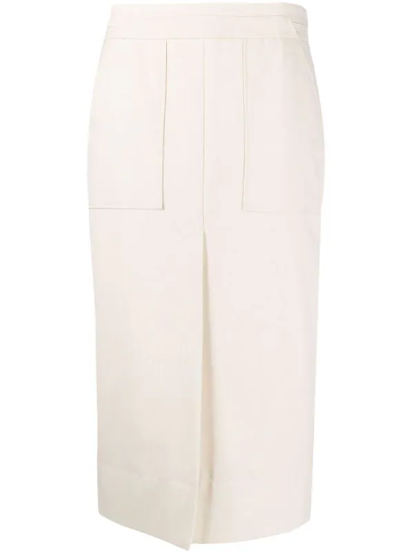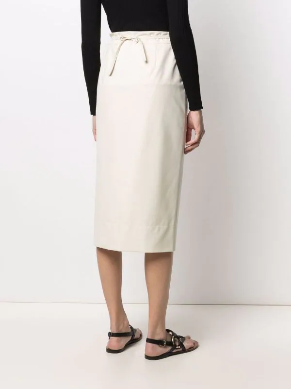 Construction stretch, fente sur le devant, fermeture nouée au dos, poches latérales fendues, coupe mi-longue.