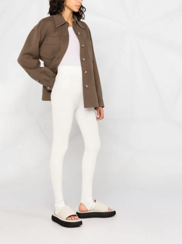 Taille haute, maille nervurée, construction stretch, détails de sous-pieds.