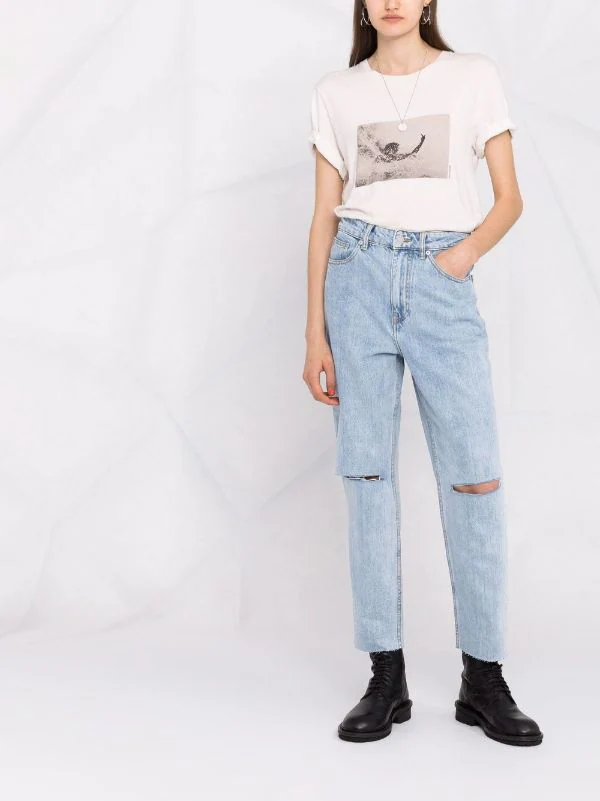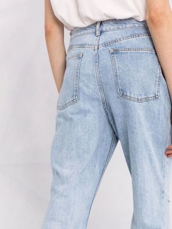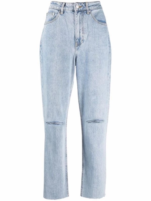 Finitions effilochées, passants de ceinture, fermeture à zip et boutons sur le devant, cinq poches classiques. Matière : coton.