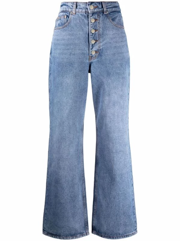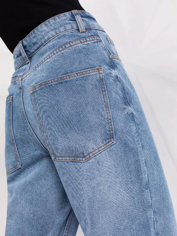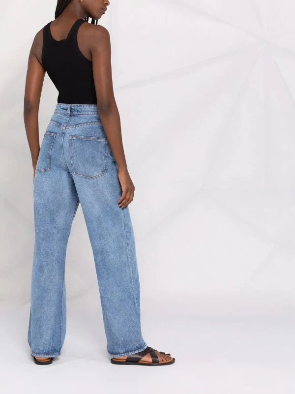Effet légèrement délavé, taille haute, cinq poches classiques, coupe droite. Matière : coton.