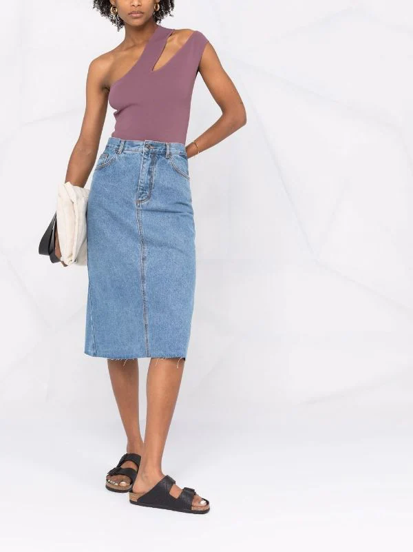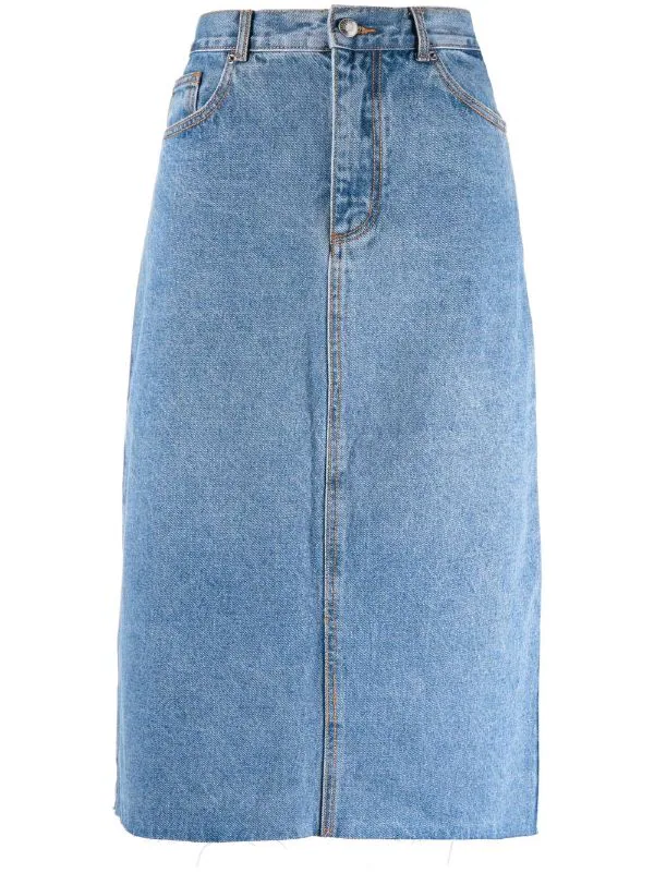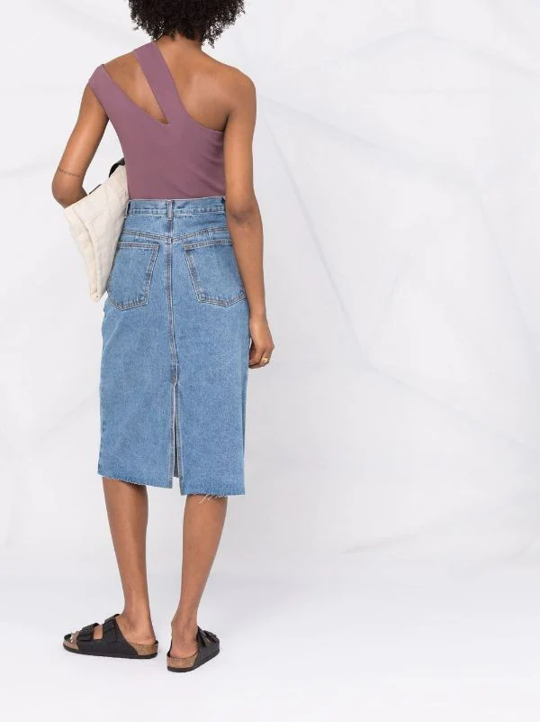 Coutures ton sur ton, taille haute, passants de ceinture, fermeture à zip et boutons sur le devant, cinq poches classiques, fente à l’arrière, ourlet droit, longueur au dessous du genou. Matière : coton.