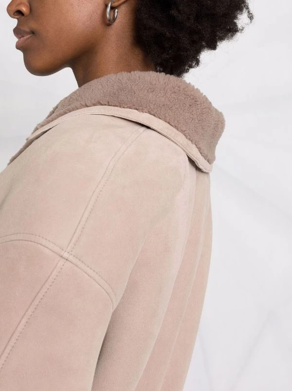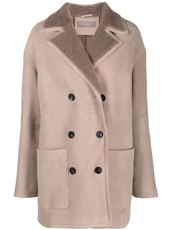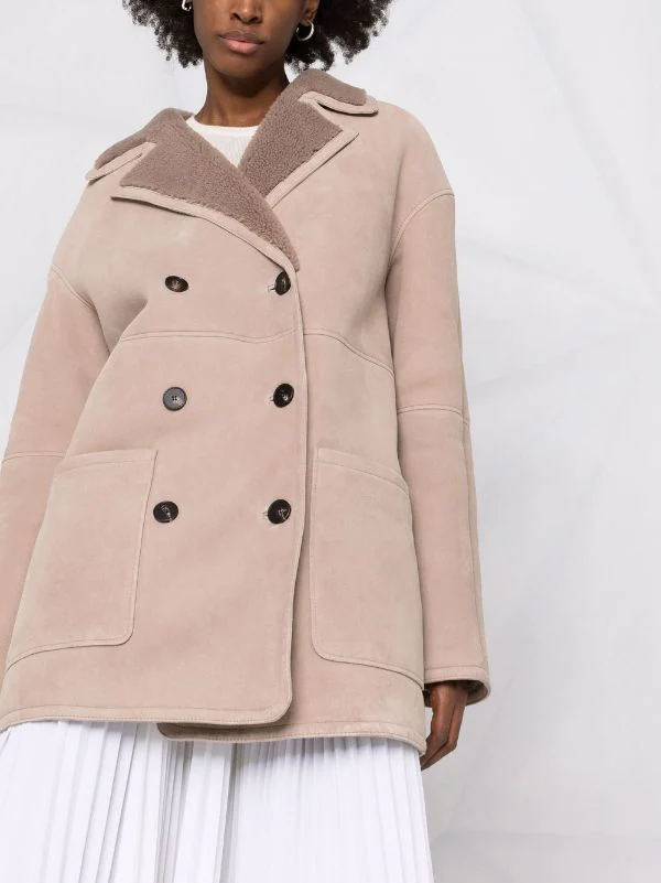 Revers crantés, deux poches plaquées avant, boutonnière croisée, manches longues. Matière : peau de mouton.