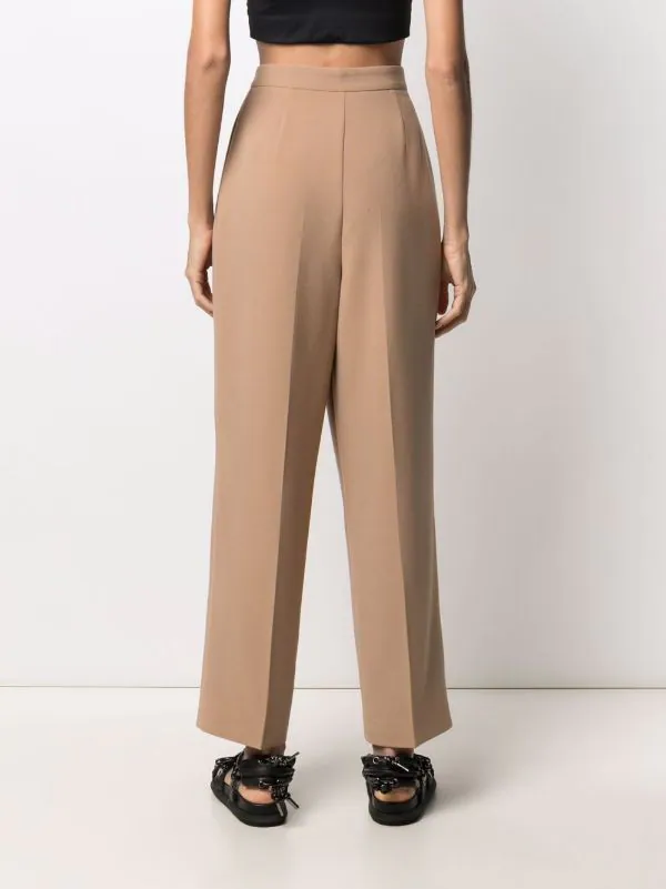 Taille haute, détails de plis, deux poches latérales fendues, fermeture dissimulée sur le devant, coupe fuselée.