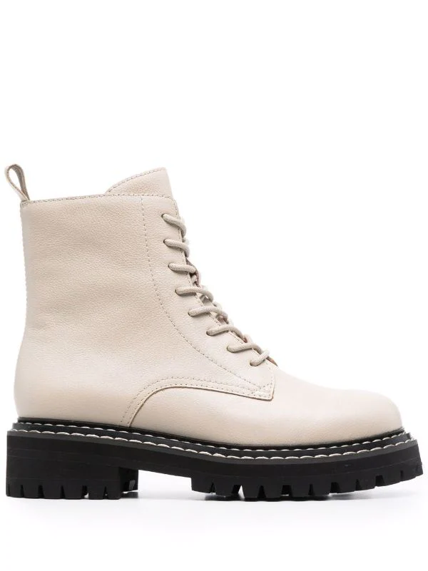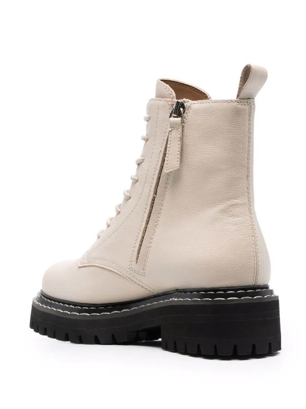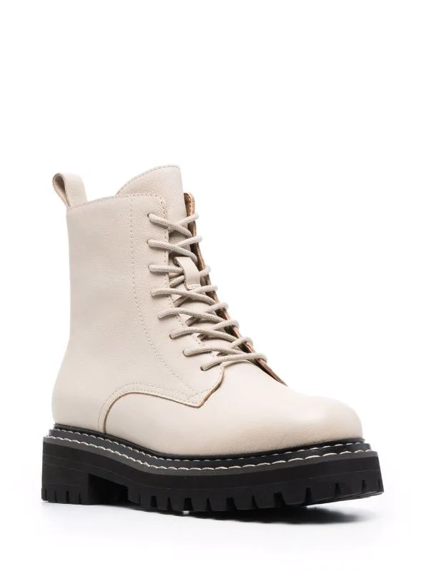 Semelle intérieure à logo, bout rond, languette d’enfilage au talon, hauteur cheville, fermeture à lacer sur le devant, fermeture zippée sur les côtés, semelle épaisse crantée en caoutchouc.