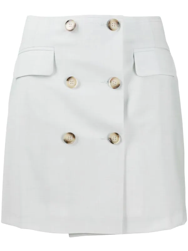 Taille haute, boutons décoratifs, poches devant à rabat, ourlet droit.
