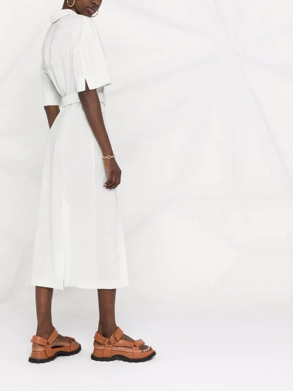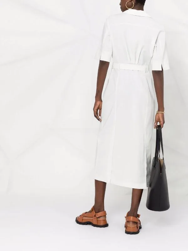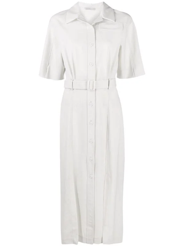 Col à larges revers crantés, boutonnière sur le devant, manches courtes, coupe mi-longue. Couleur : blanc.