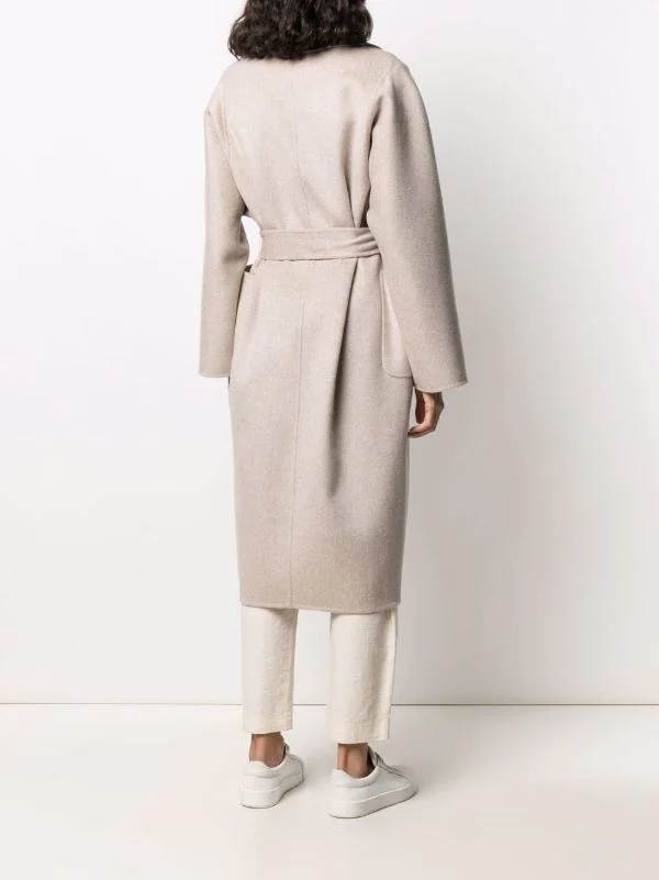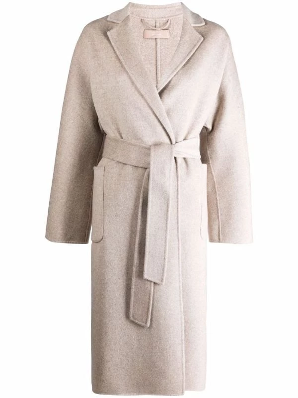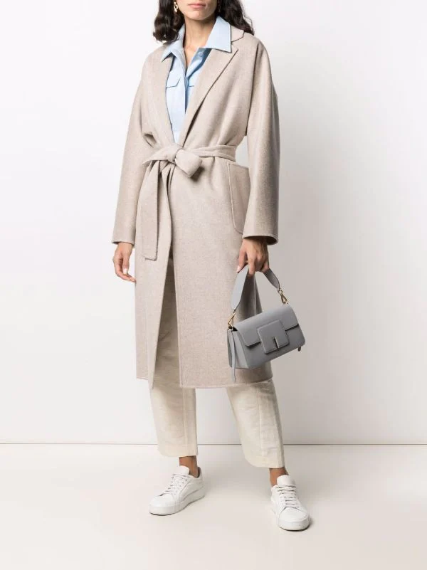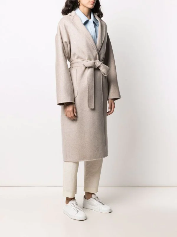 Taille nouée, revers classiques, manches longues, deux poches plaquées avant. Matière : laine.