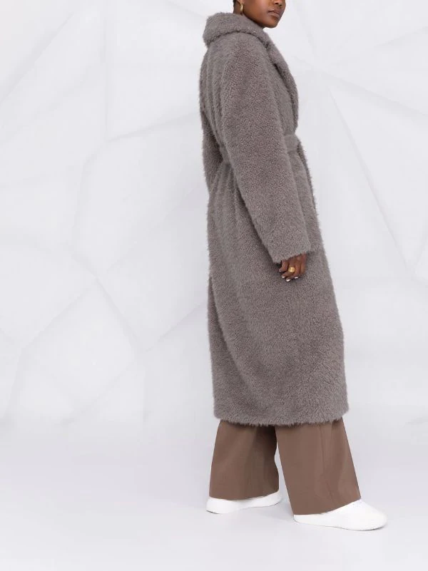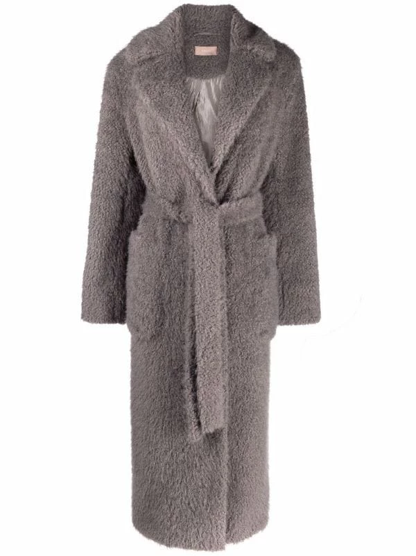 Fini texturé, revers crantés, épaules tombantes, manches longues, deux poches plaquées avant, taille ceinturée, coupe mi-longue. Couleur : gris.