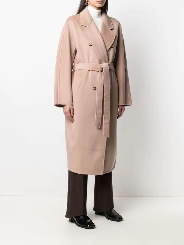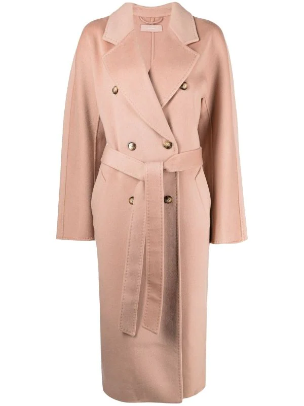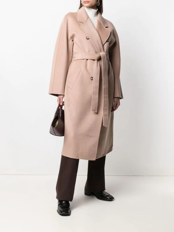 Boutonnière croisée, taille ceinturée, col cranté, manches longues, deux poches latérales passepoilées.