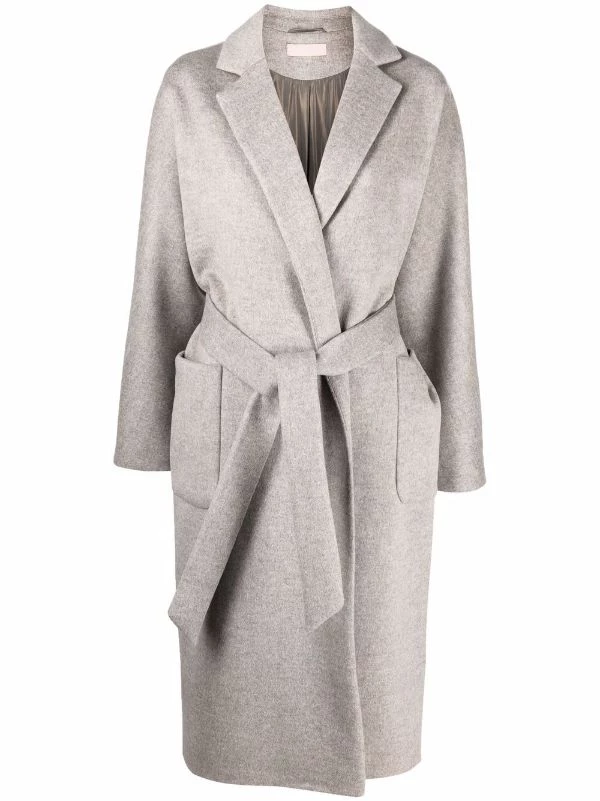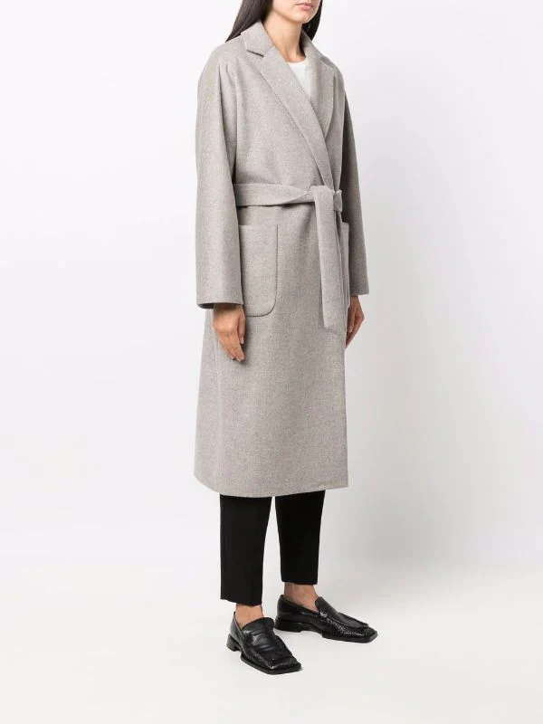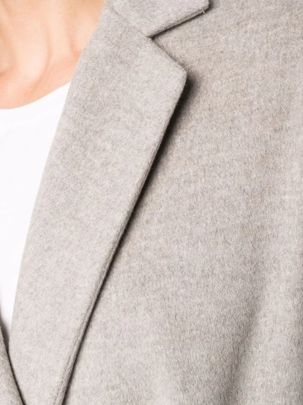 Revers crantés, manches longues, taille ceinturée, deux poches à rabat.