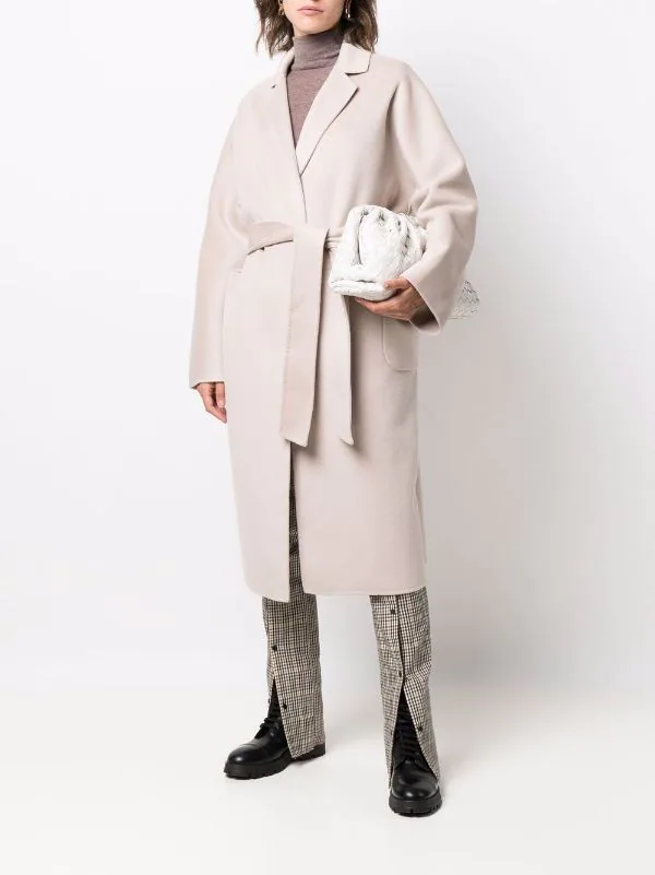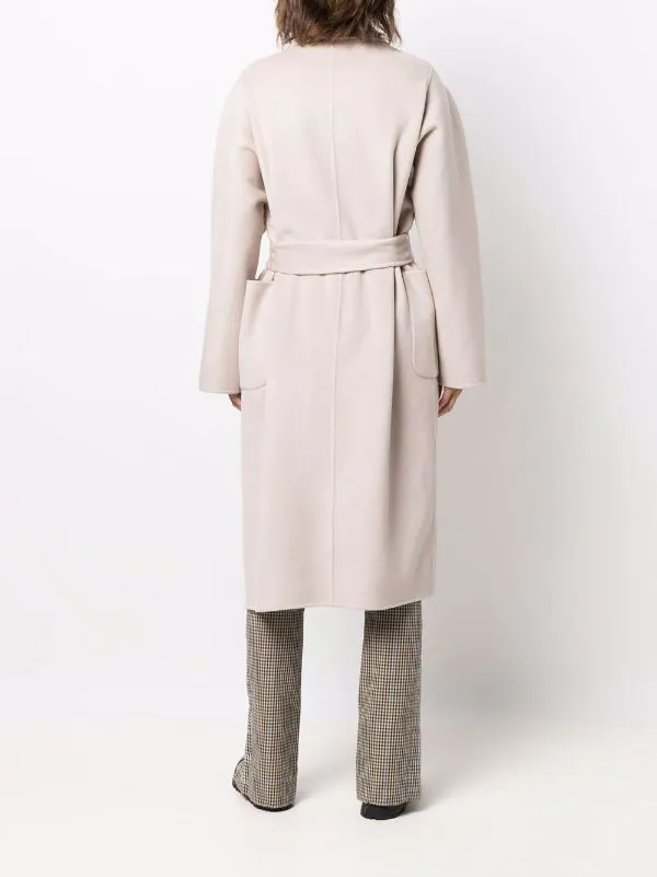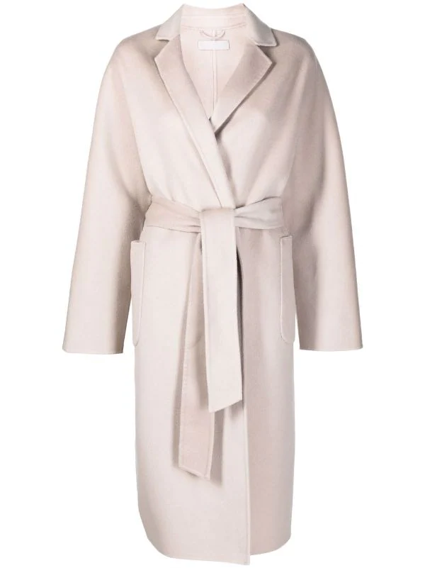 Revers classiques, taille ceinturée, deux poches plaquées avant, manches longues.