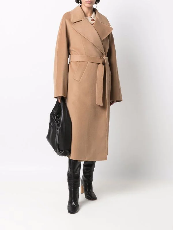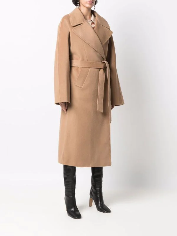 Revers crantés, coutures ton sur ton, taille ceinturée, manches longues. Couleur : marron. Matière : laine.