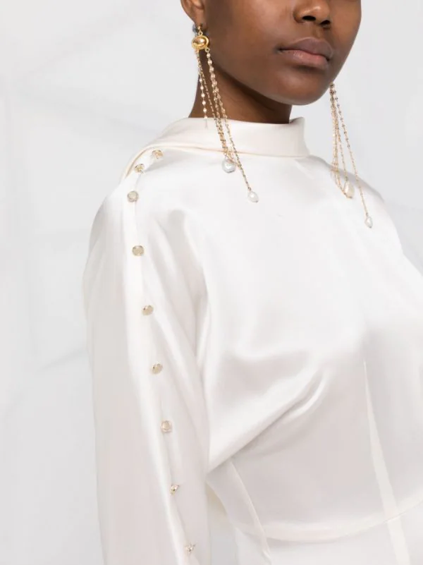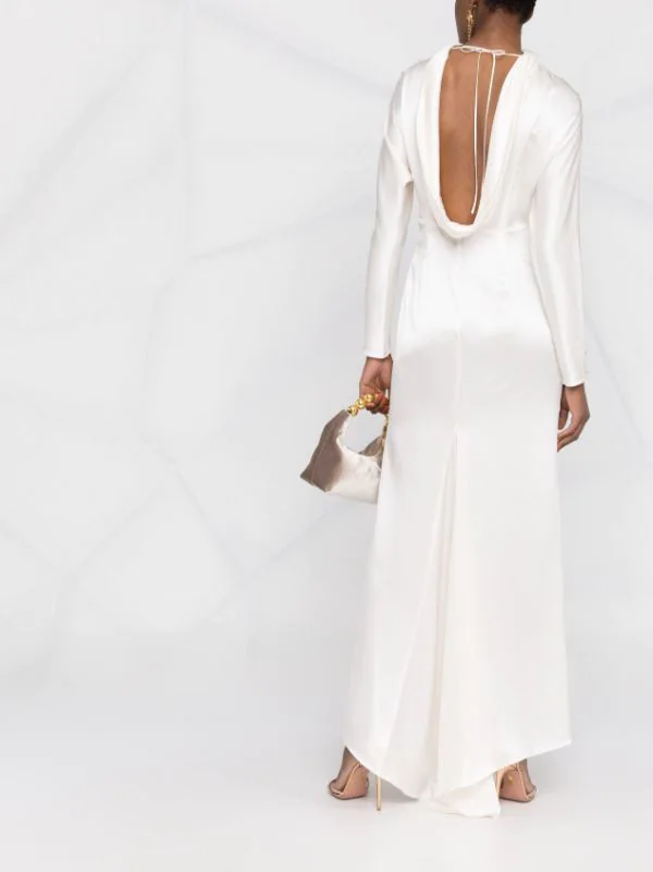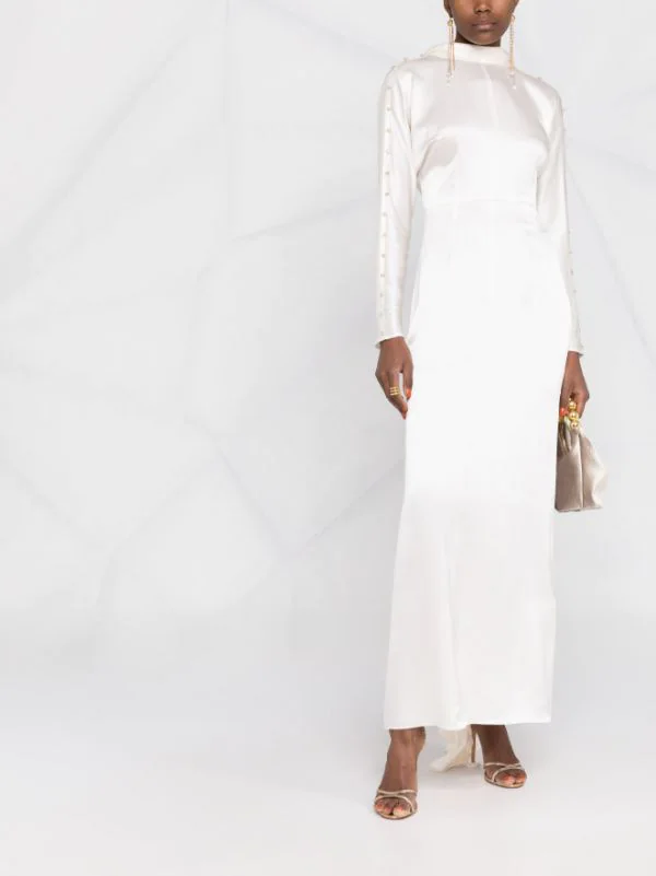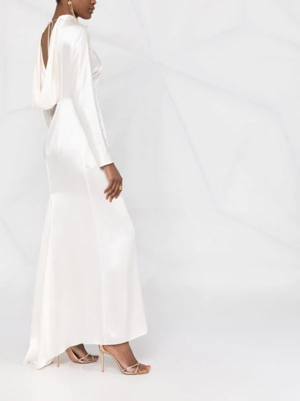 Boutons décoratifs, col bénitier, décolleté au dos, manches longues, taille empire, longueur maxi. Matière : soie.