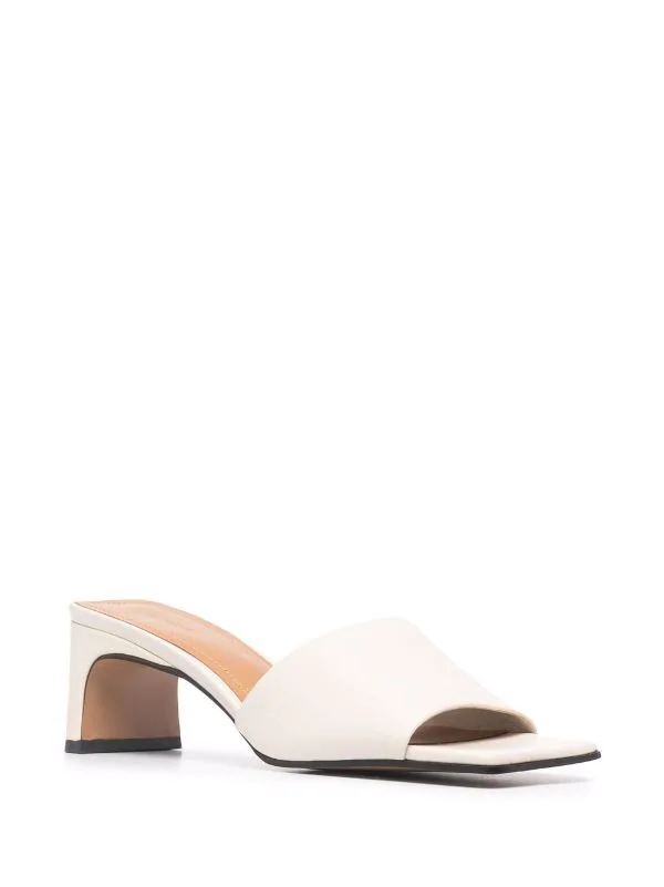 Design à enfiler, bout ouvert, bride à un doigt, semelle intérieure griffée, talon mi-haut. Matière : cuir.