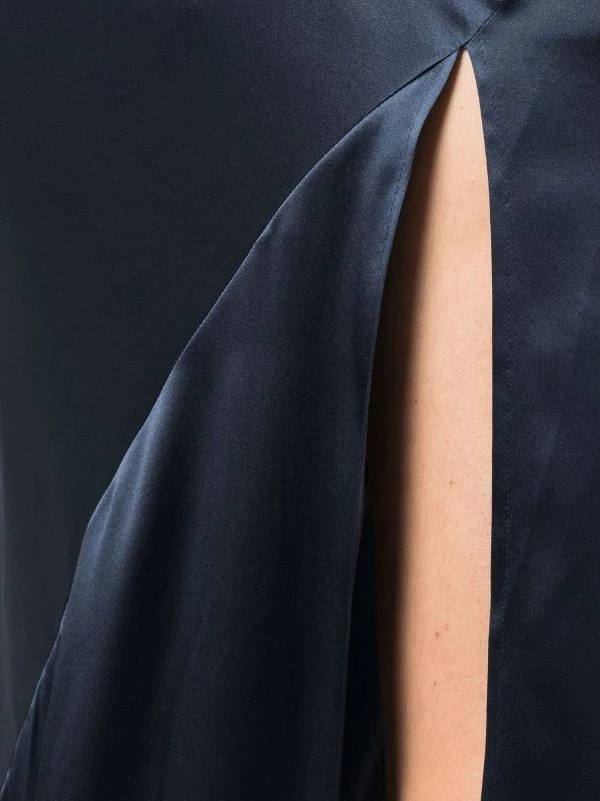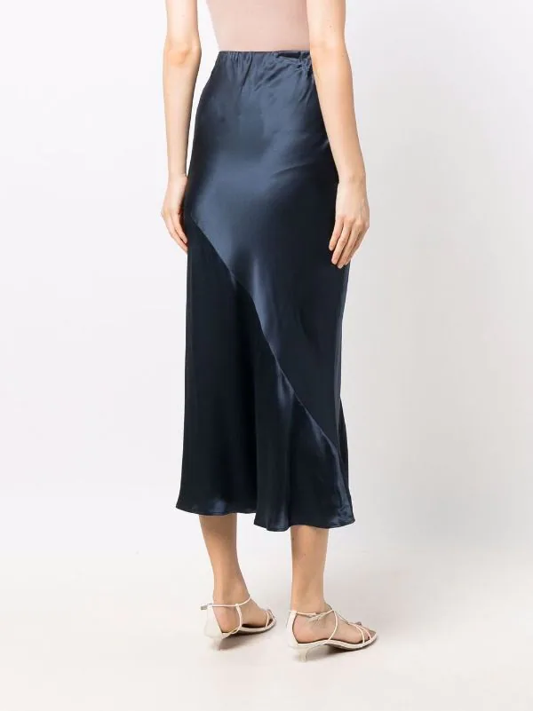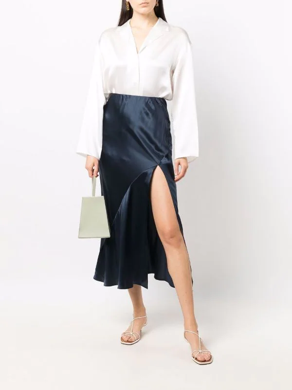Fini satiné, fente latérale, ceinture élastique, coupe mi-longue. Matière : soie.