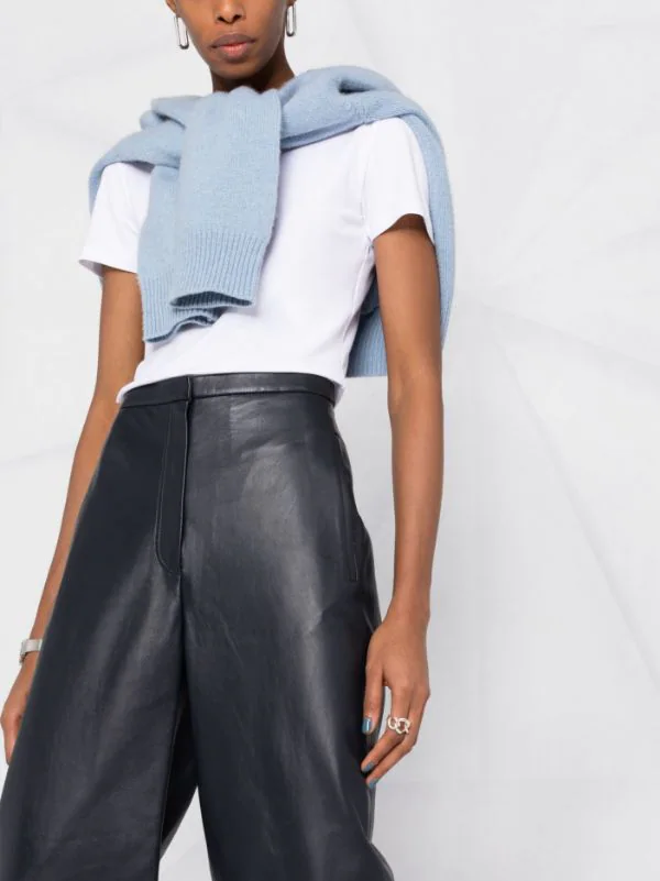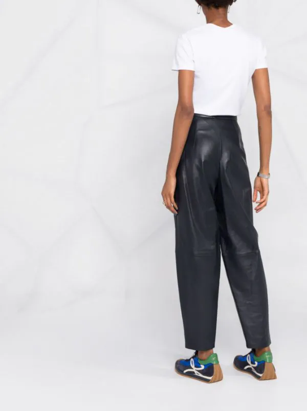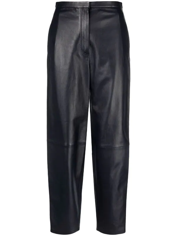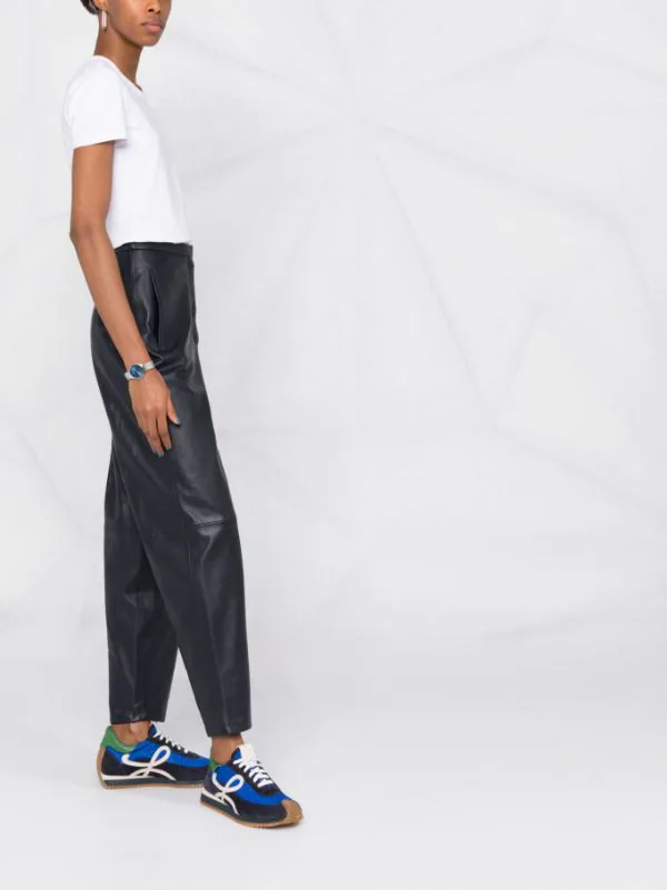 Coupe fuselée, fermeture zippée sur les côtés, taille mi-haute. Matière : cuir.