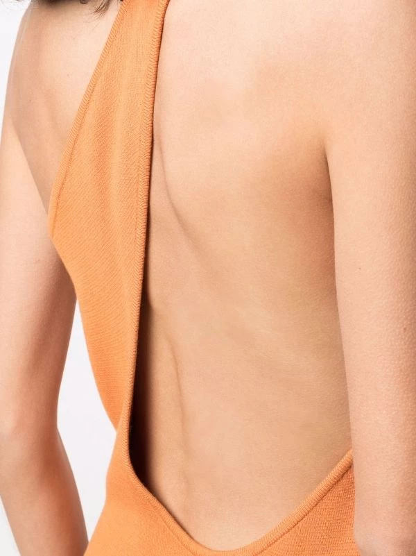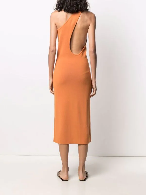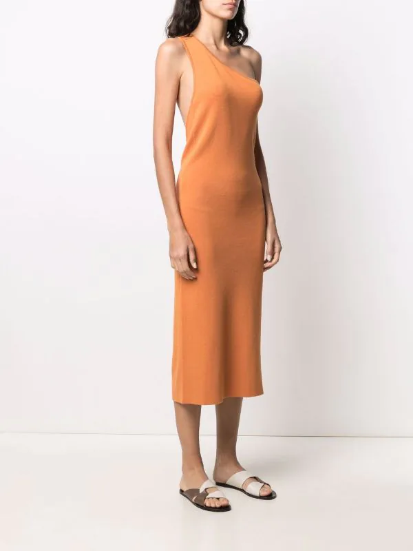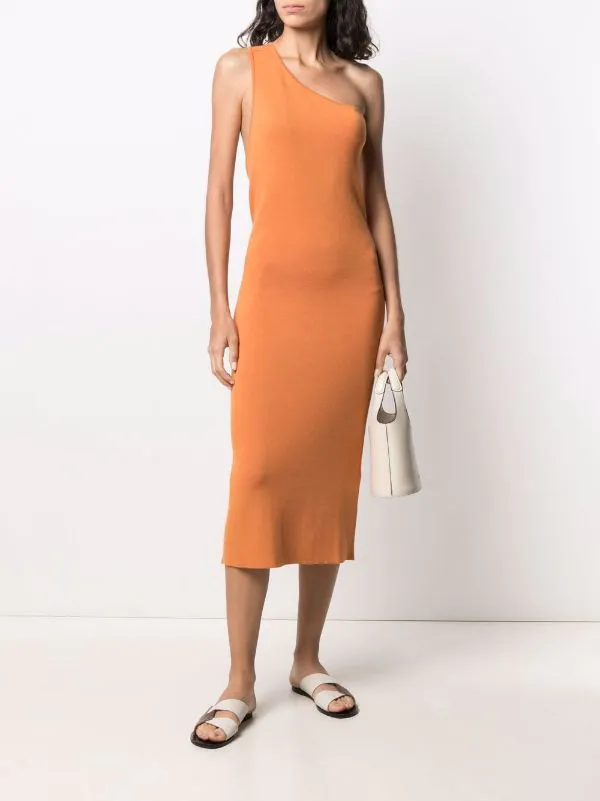 Détail nervuré, talon ouvert, design asymétrique à une épaule, longueur au dessous du genou. Couleur : orange.