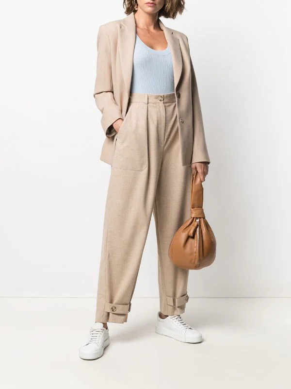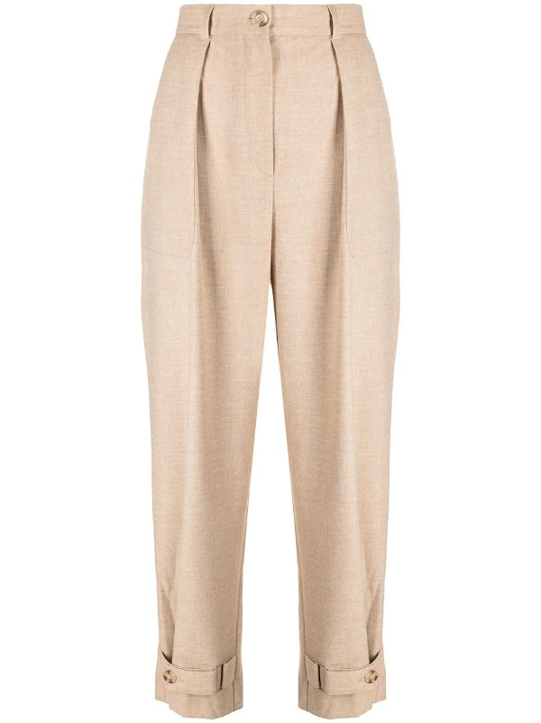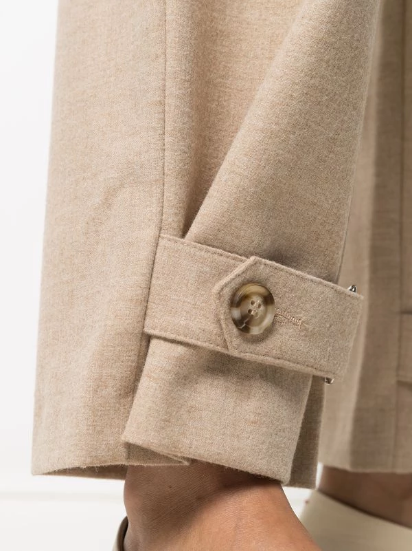 Taille haute, poignets boutonnés, fermeture boutonnée, passants de ceinture, poches arrière passepoilées.