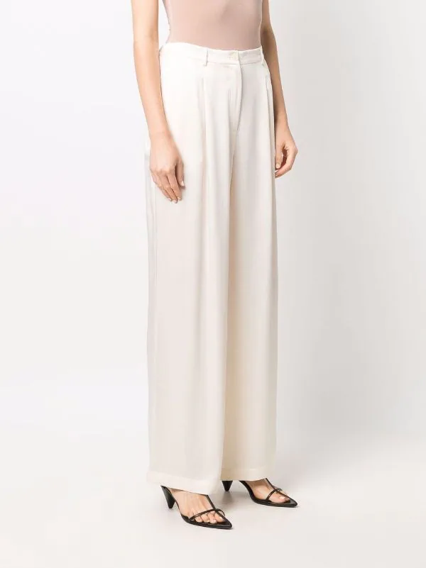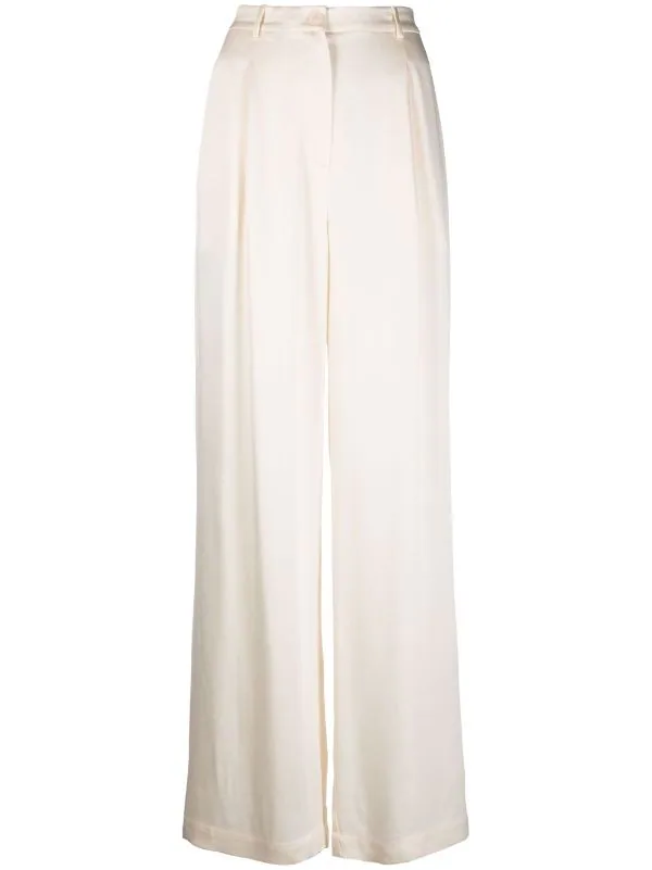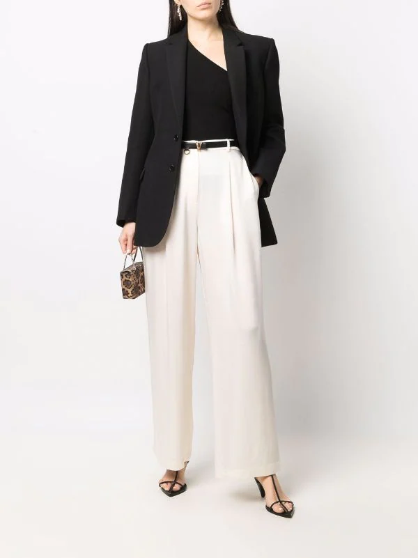 Coupe ample, détails de plis, passants de ceinture, fermeture dissimulée sur le devant, poches latérales fendues.