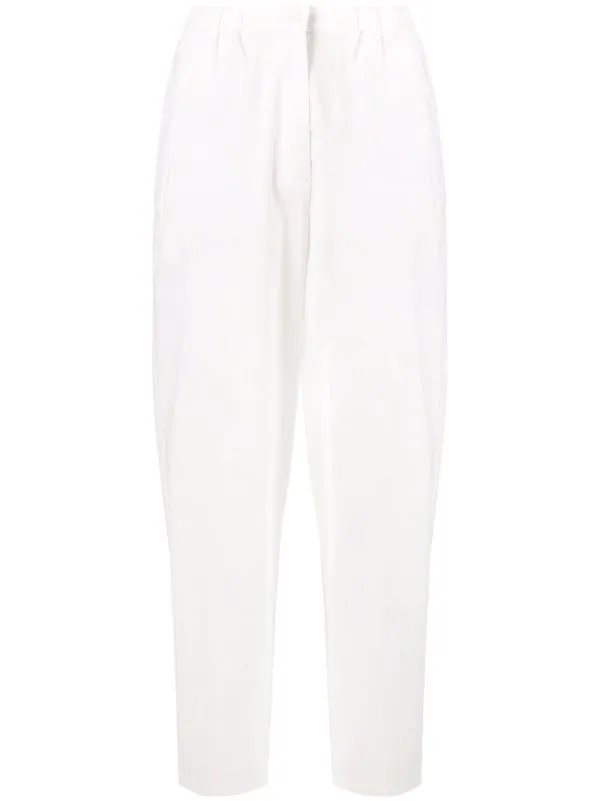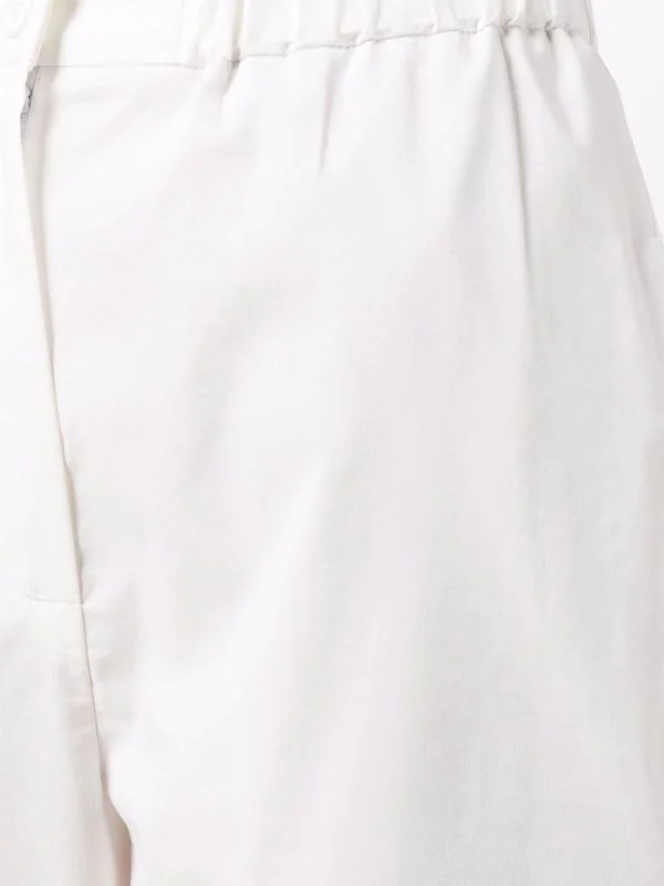 Ceinture élastique, boutonnière sur le devant, poches latérales fendues, poche arrière passepoilée. Couleur : blanc.