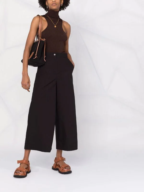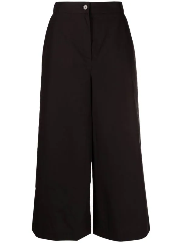 Taille haute, coupe ample, longueur crop, fermeture à zip et boutons sur le devant, deux poches latérales fendues. Couleur : noir. Matière : coton.
