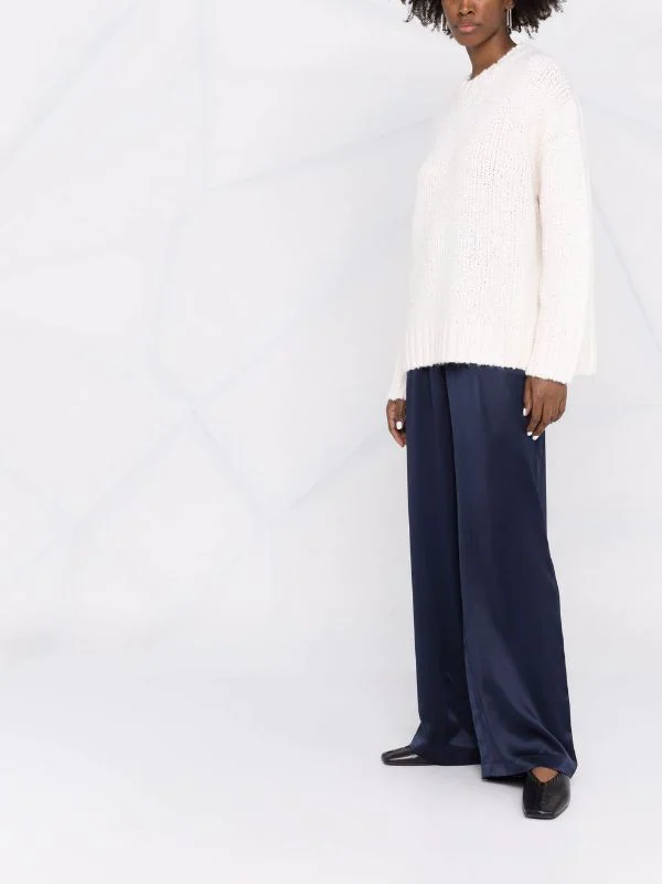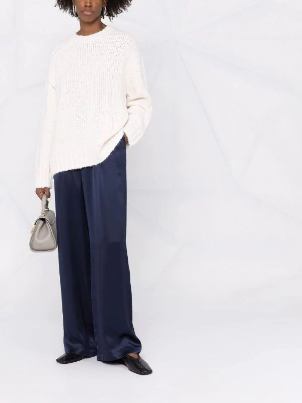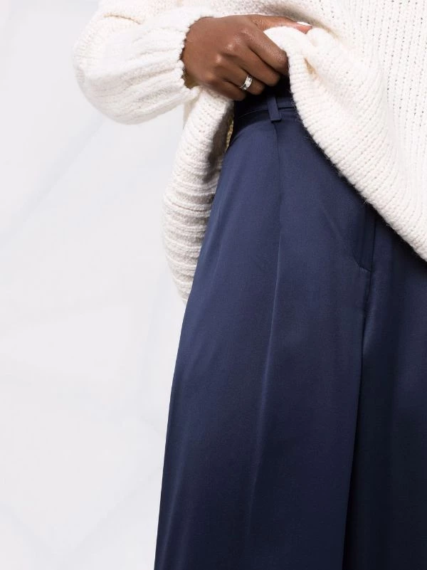 Taille haute, fermeture dissimulée sur le devant, deux poches latérales fendues, coupe ample. Matière : soie.