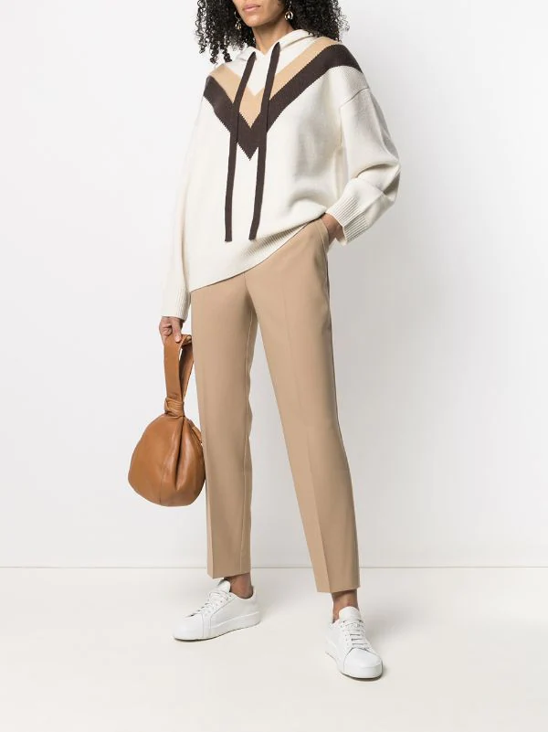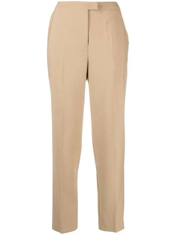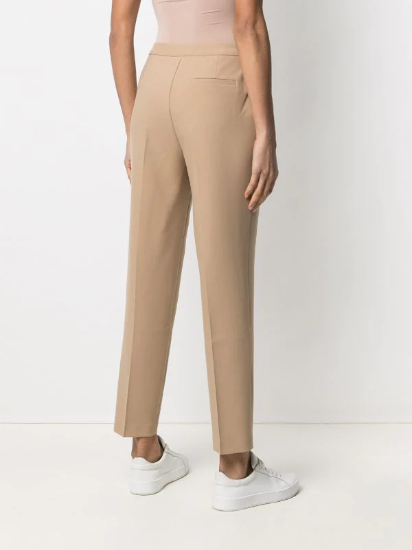 Plis marqués, taille haute, fermeture dissimulée sur le devant, coupe ajustée, deux poches latérales passepoilées, poche arrière passepoilée.