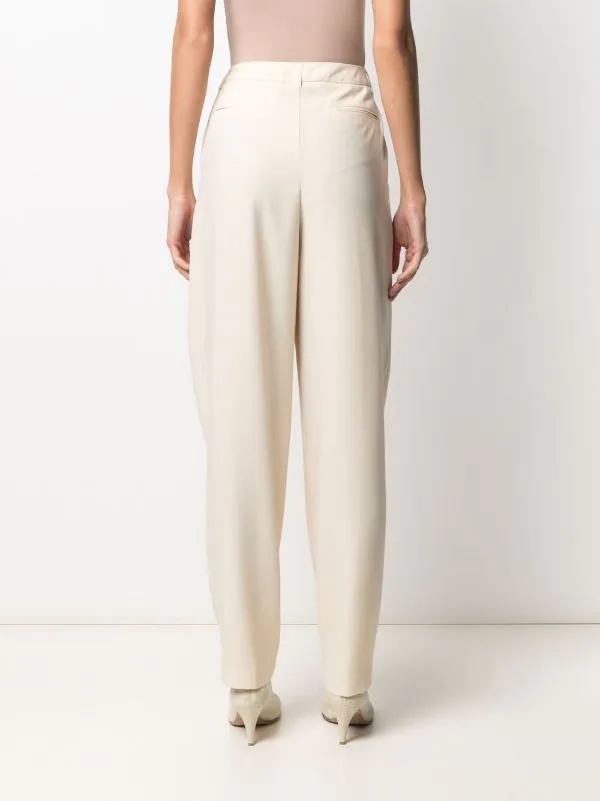 Fermeture boutonnée, taille haute, passants de ceinture, deux poches latérales fendues, poches arrière passepoilées.